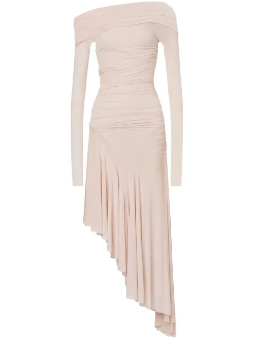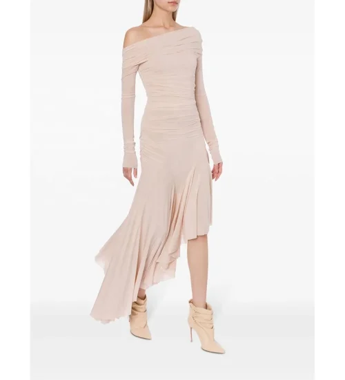 New Arrival Draped Asymmetric Neck Extra-Long Sleeves Rose Pink Midi Dress Women Dress