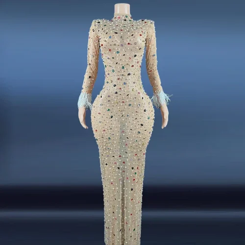 New Woman Clothes 2022 Trending Multicolor Flashing Sexy Rhinestone Evening Gowns Feather Cuffs Long Mesh Tight Maxi Dress