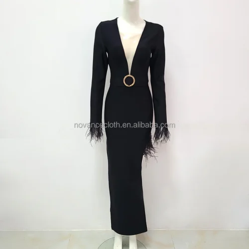 NOCANCE B3268 2023 New Arrivals Deep v Neck Sexy High Slit Black Evening Dresses Elegant Feather Long Dress for Women Party