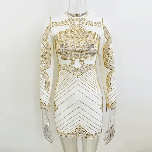 Ocstrade 2023 Spring Long Sleeve Mini Dress New Luxury Ironing Metal Elastic Tight Long Sleeve Dress Women Beaded Casual Dresses