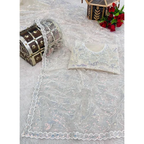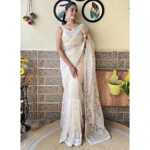 Off-White Sequins Work Evening Dress Party Wear Mono Net Saree