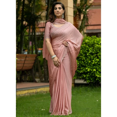 Peach Satin Chiffon Evening Dress Hand Work Party Wear Saree