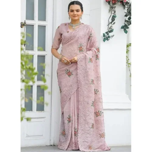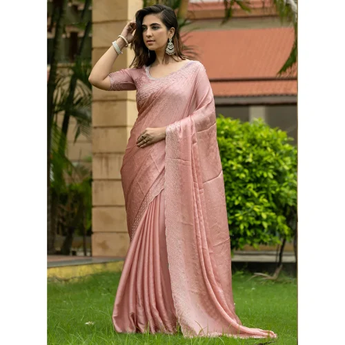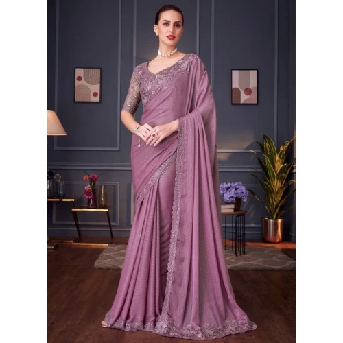 Pink Shimmer Silk Saree with Embroidery Work Party Wear Evening Dress