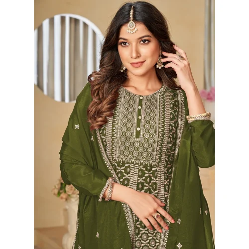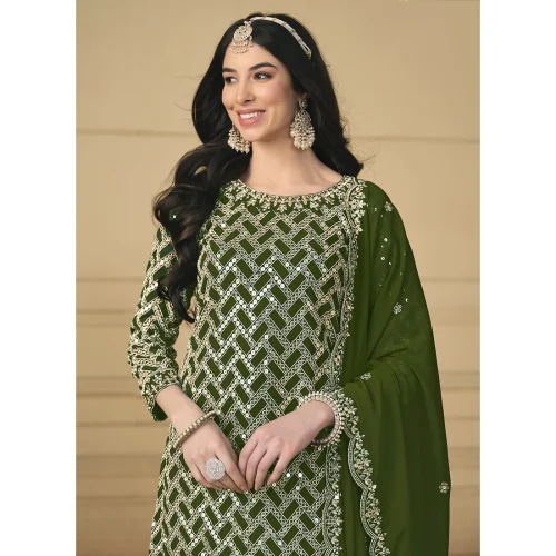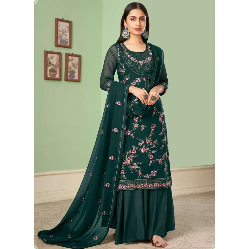 Women’s Bottle Green Embroidery Work Georgette Palazzo Suit Elegant and Stylish