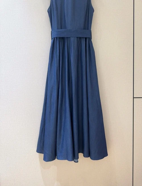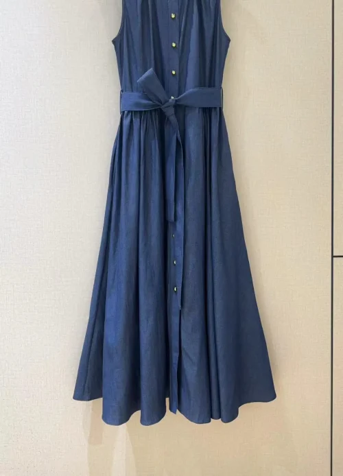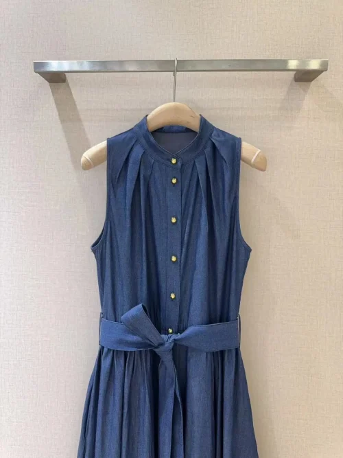 Product Name: 100%Cotton Denim Dress 2025 Summer Style Women Button Front Belt Deco Sleeveless Mid-Calf Length Casual Blue Jeans Dress Vestido