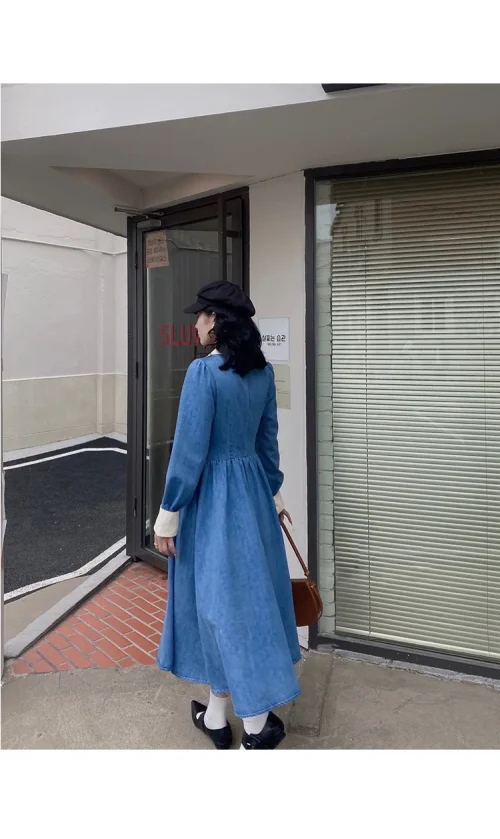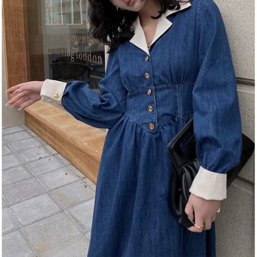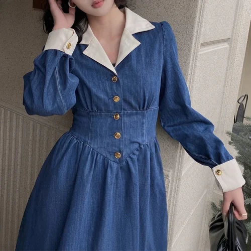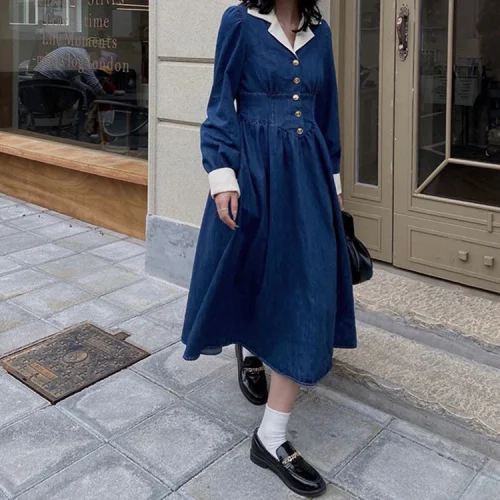 Product Name: 2022 Women’s Vintage Spring Single-breasted Long Sleeve Contract Collar Cuff Sleeve Fit and Flared Casual Denim Midi Dress