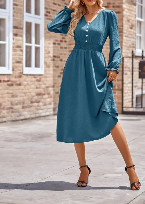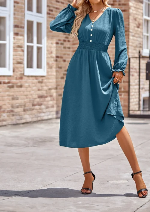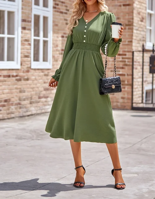 2023 Autumn and Winter New Women’s V-neck Waist Casual Comfortable Solid Color Mid-length Women’s Dress