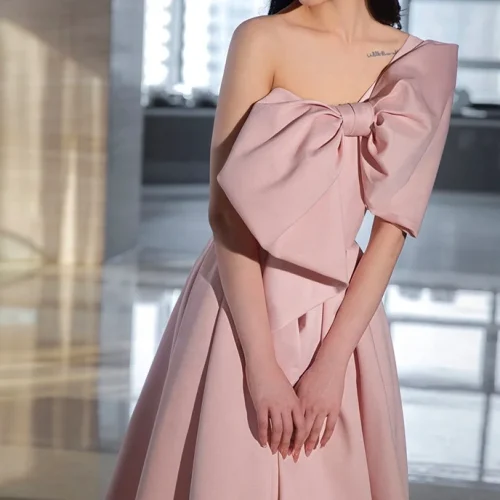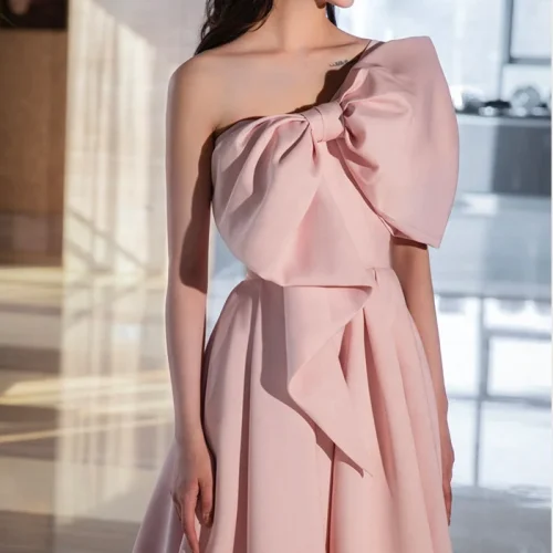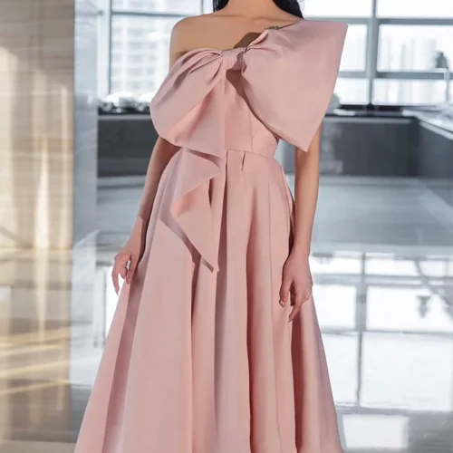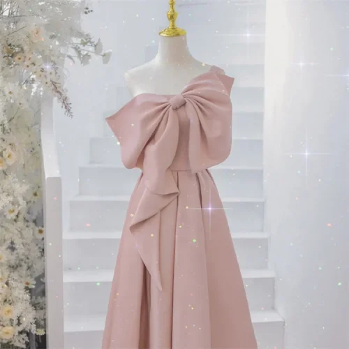 2023 Spring New Pink Bow Dress Elegant Host Banquet Evening Dress Sleeveless Solid Color Satin Evening Dress
