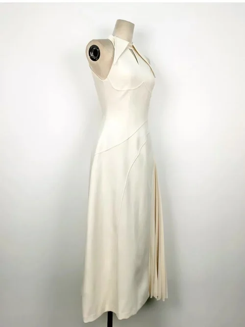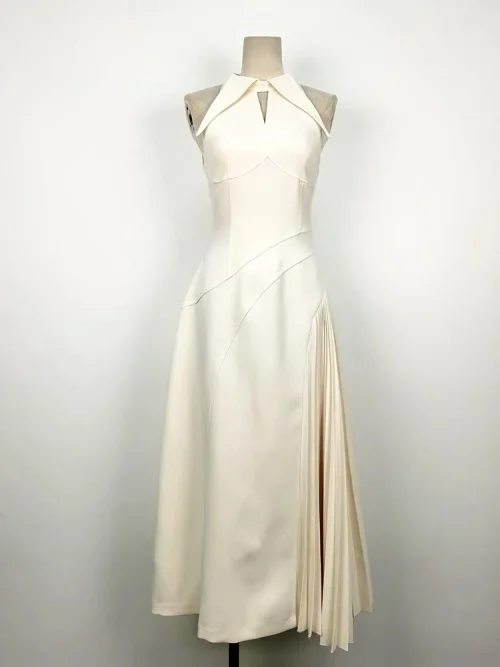 Product Name: 2024 New Arrival High-End Asymmetrical Pleat Dress Pointy Collar Big Swing Sleeveless Design Woven Solid Pattern Ruffles