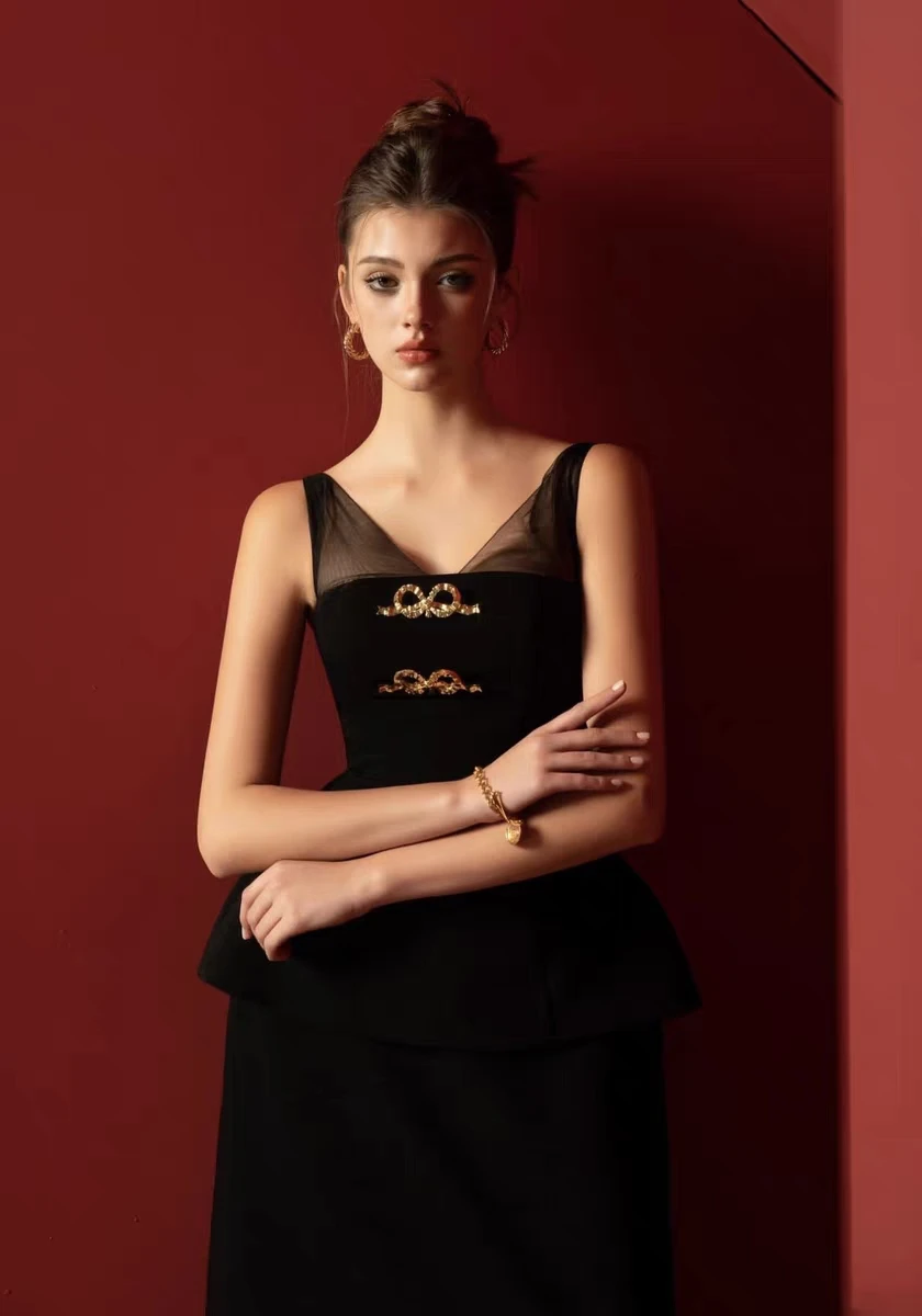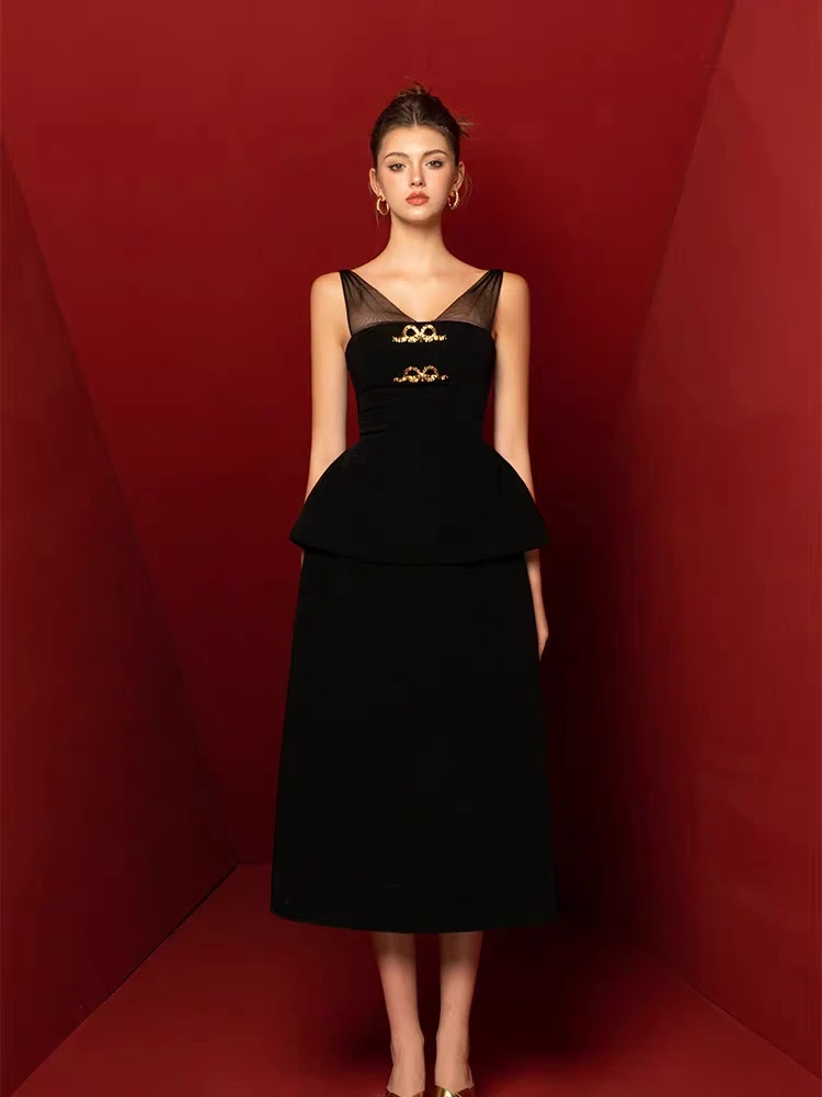 Product Name: 2024 New Women’s Fashion Black Long Dress Socialite Style Waist Slimming Elegant Women Dress Set