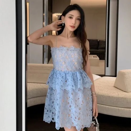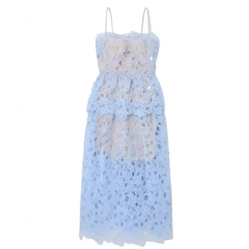 Product Name: 2024 Summer New Women’s Clothing Light Blue Laser Embroidery Cake Dress Halter Skirt 2-piece Set Long