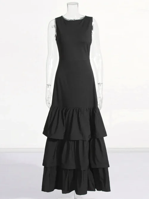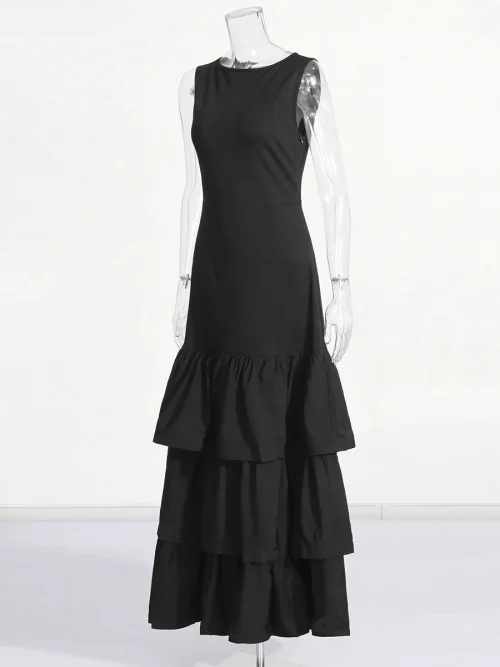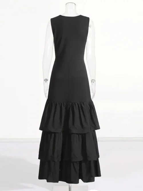 Product Name: 2024 Women’s Spring New Fashion Sexy Black Round Neck Sleeveless Splicing Ruffled Buttock Wrap Fishtail Dress