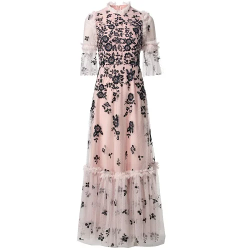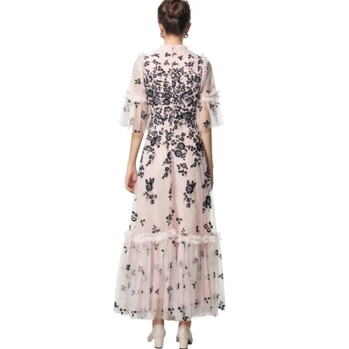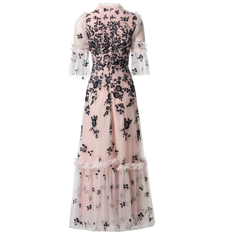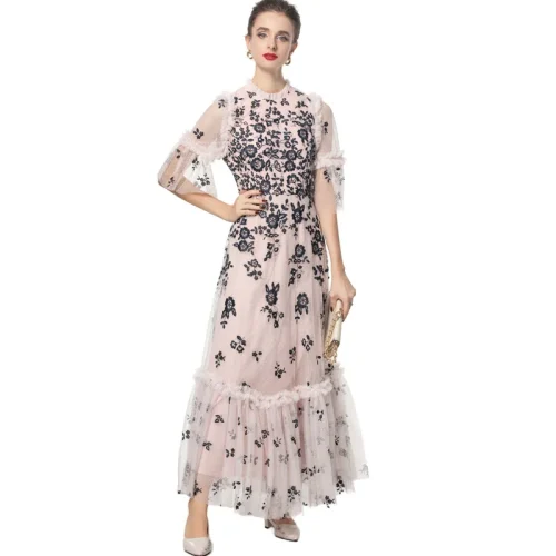 2025 Black Floral Embroidered Dress Women O-Neck Short Sleeve Ruffles Folds Casual Floral Mesh Party Spring Summer