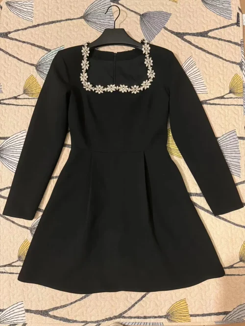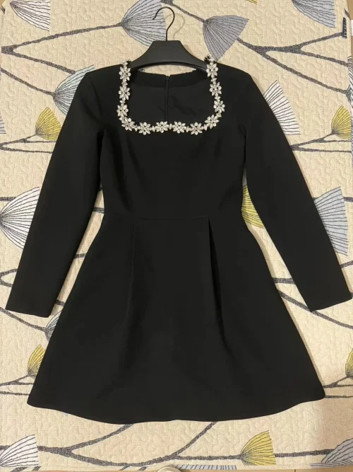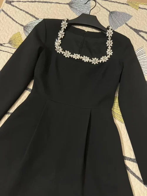 Product Name: 2025 Early Autumn New Square Collar Beaded French Dress for Women Casual Beading With Solid Pattern Office Lady