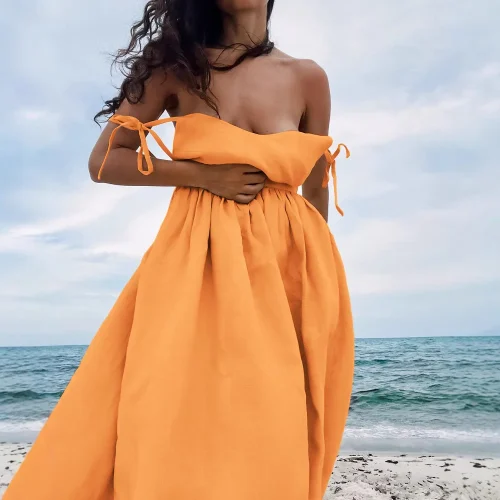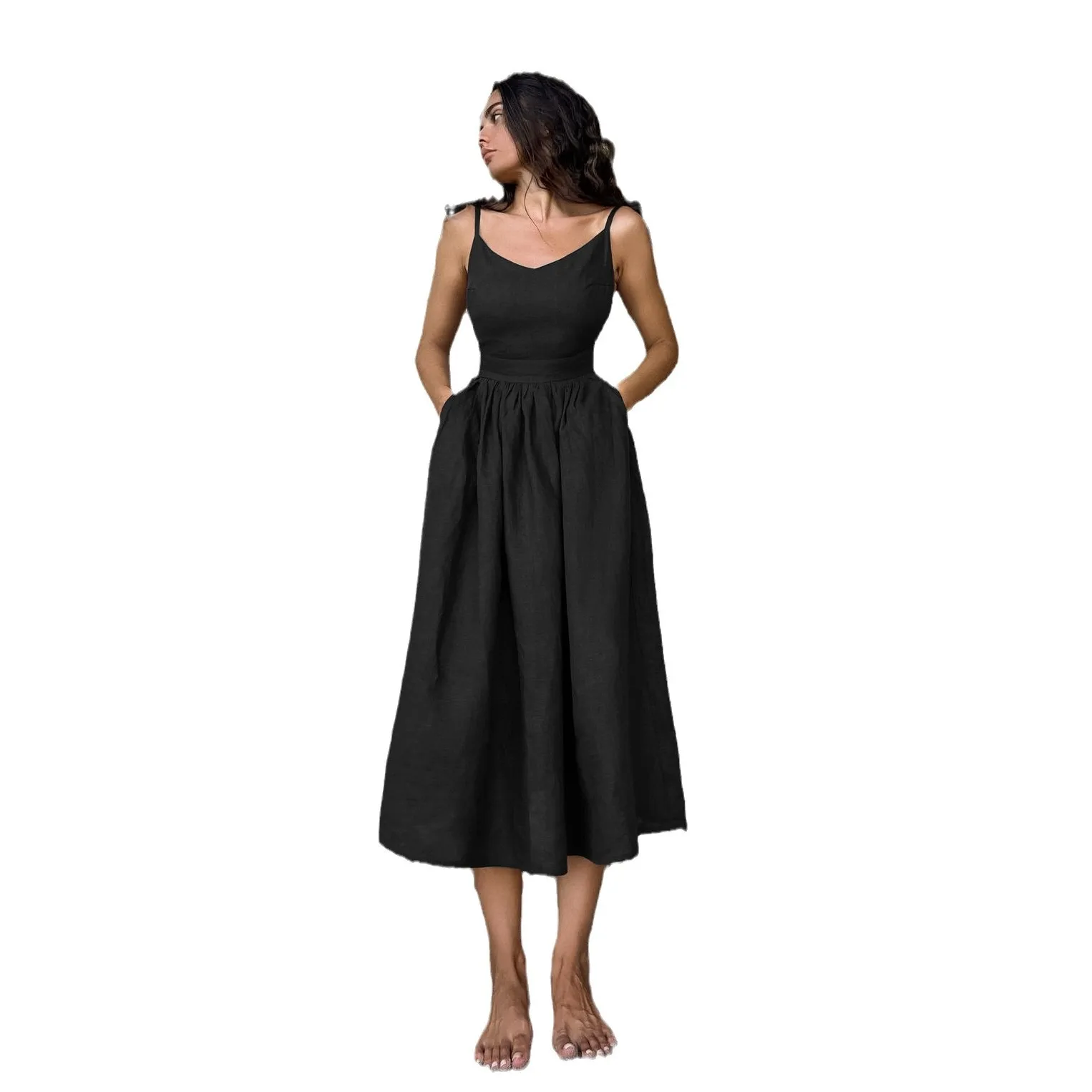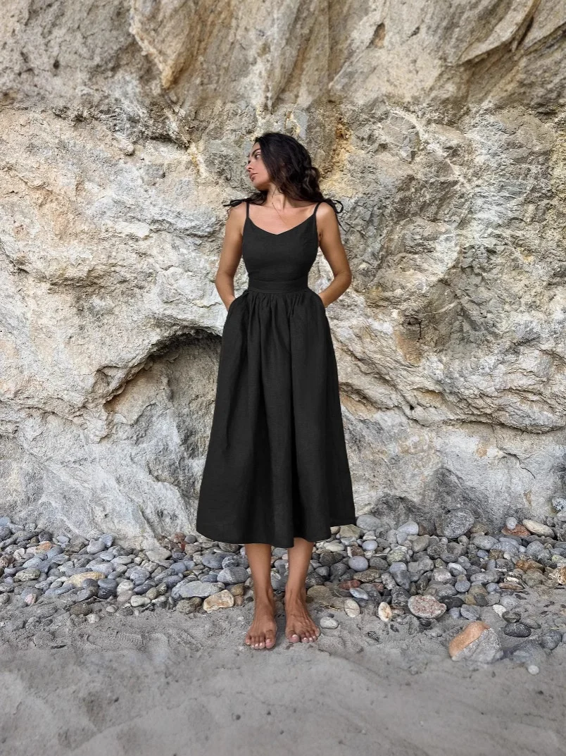 Product Name: 2025 European American Spring New Vacation Style High Waist Dress for Women French Style Khaki Cotton Linen Solid Lace
