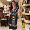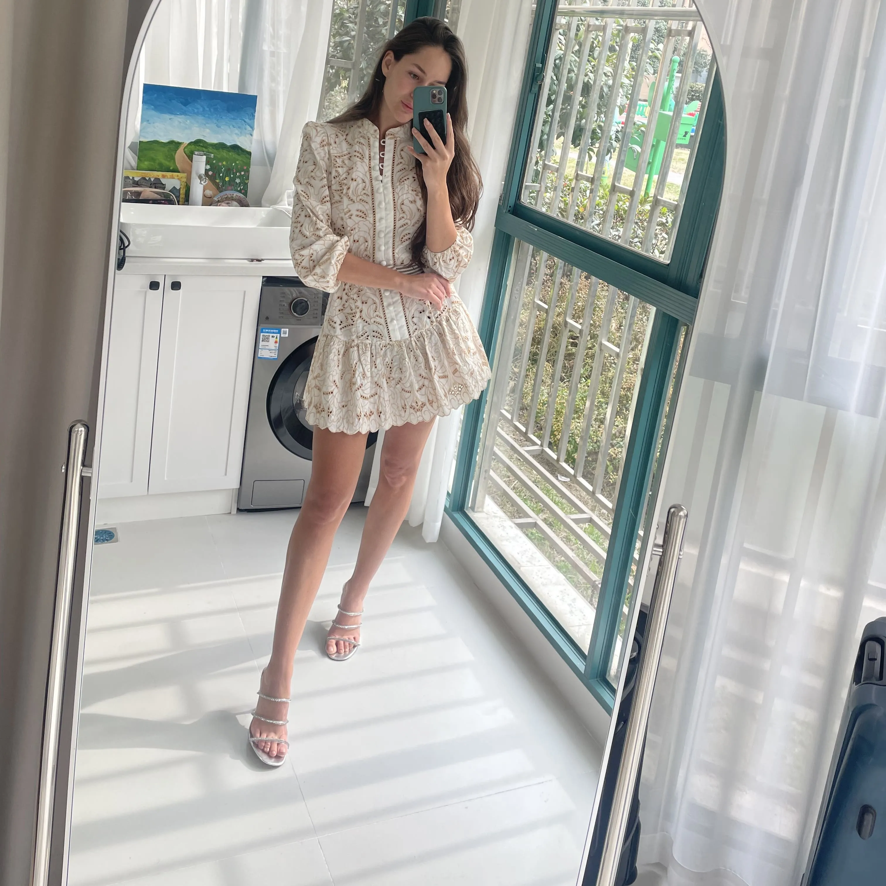 2025 New Design Long Sleeves Eyelet Cut Out Adjustable Belt Multicolour Floral White Linen Embroidery Short Dress for Women
