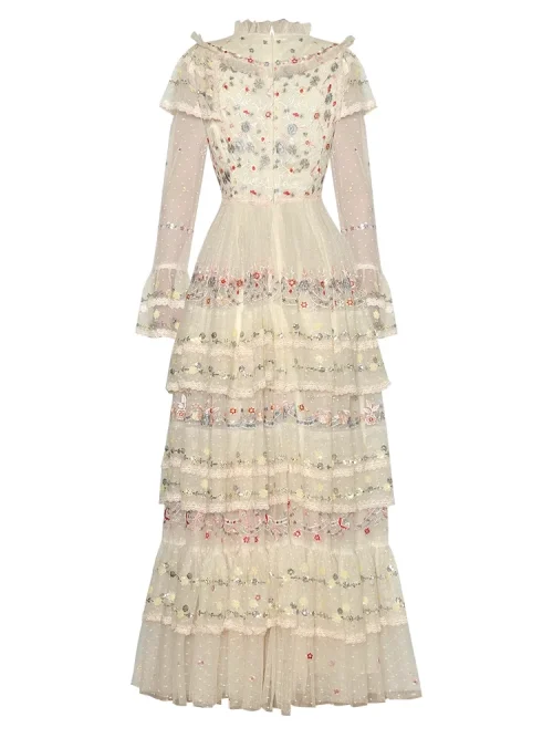 Product Name: 2025 Spring Summer New Fashion Design Women Runway High Street Long Dress Retro Embroidery Flower Mesh Ruffles A-Line Party
