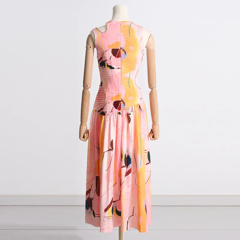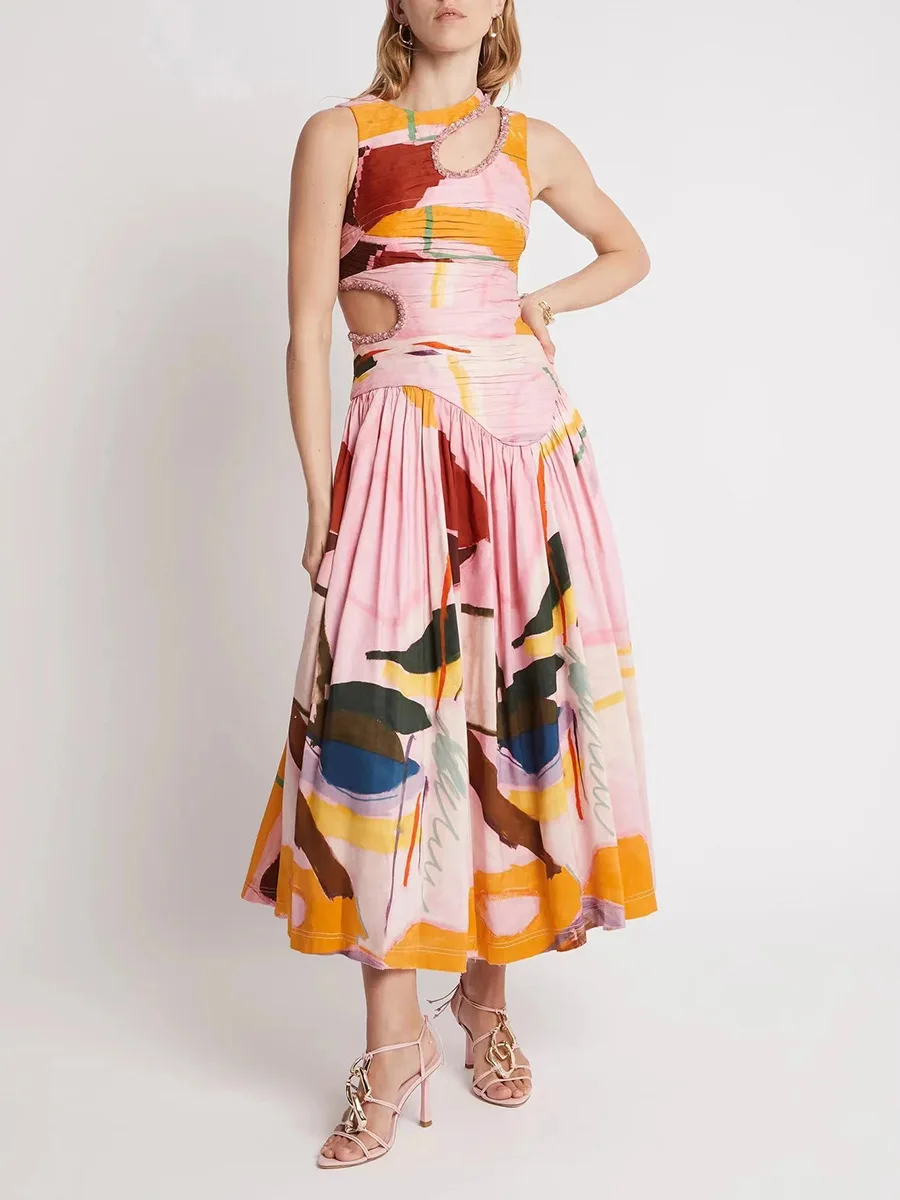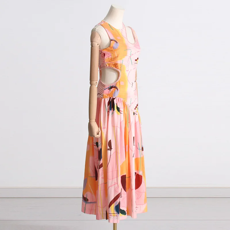 2025 Summer Elegant Sleeveless Floral Printing Hollow Out a Line Maxi Dress Women