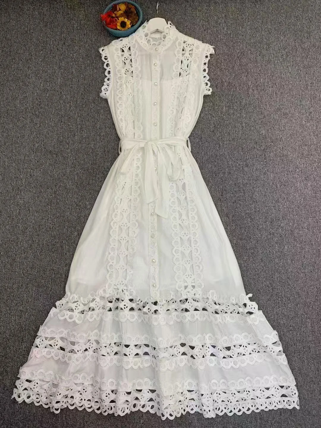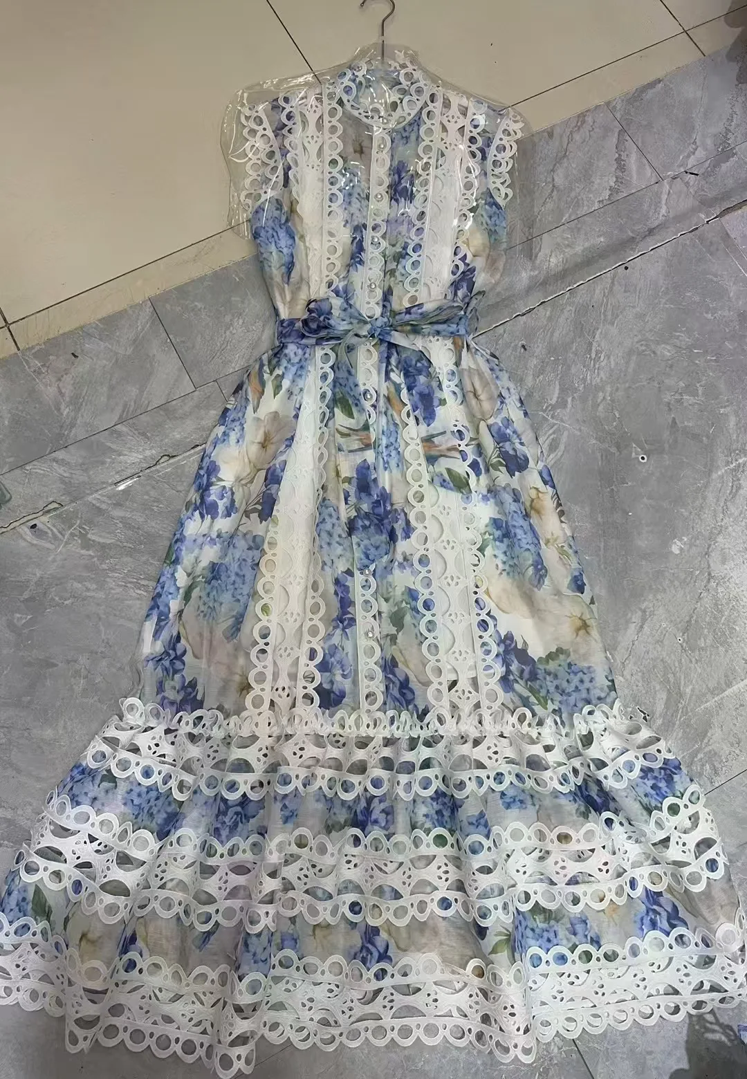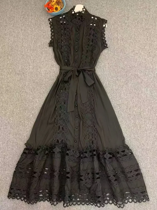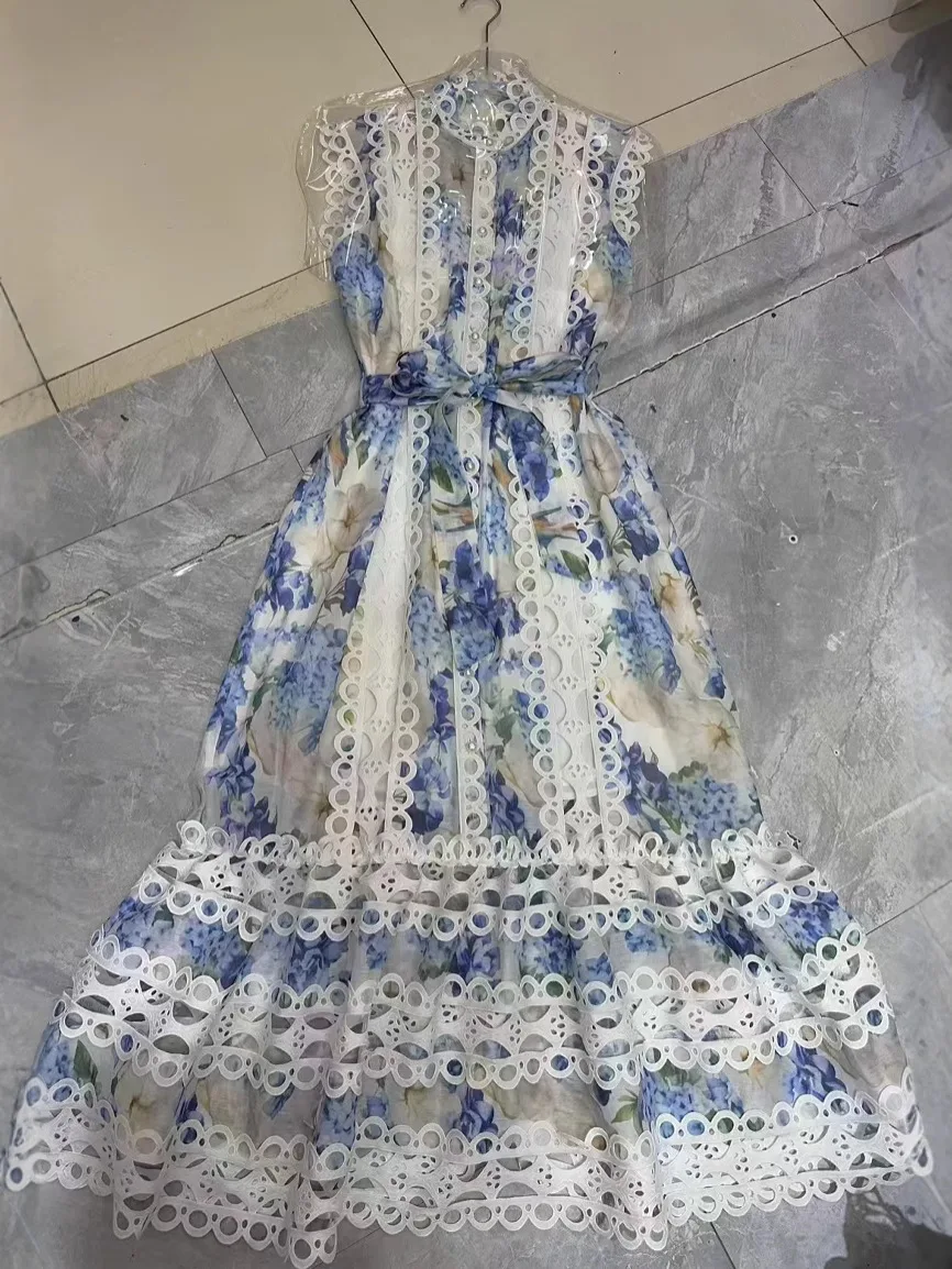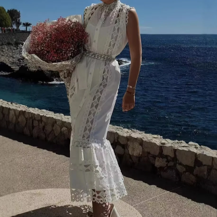 Product Name: 2025 Summer Fashion Button Vest Holiday Long Women’s Dresses Hollow Out Lace Patchwork French Elegant Blue Casual Dresses