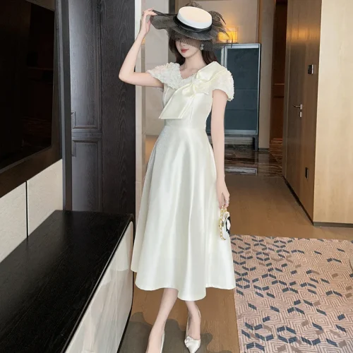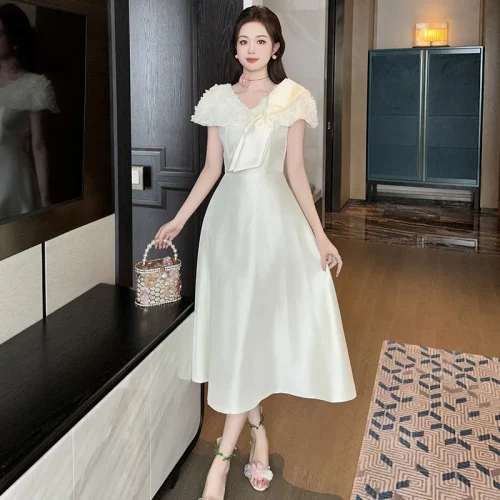 2025 Summer New Women’s Satin Dress Fluffy Full Swing Empire Waistline French Design Bow Casual Floor-Length Style-9893 Skirt