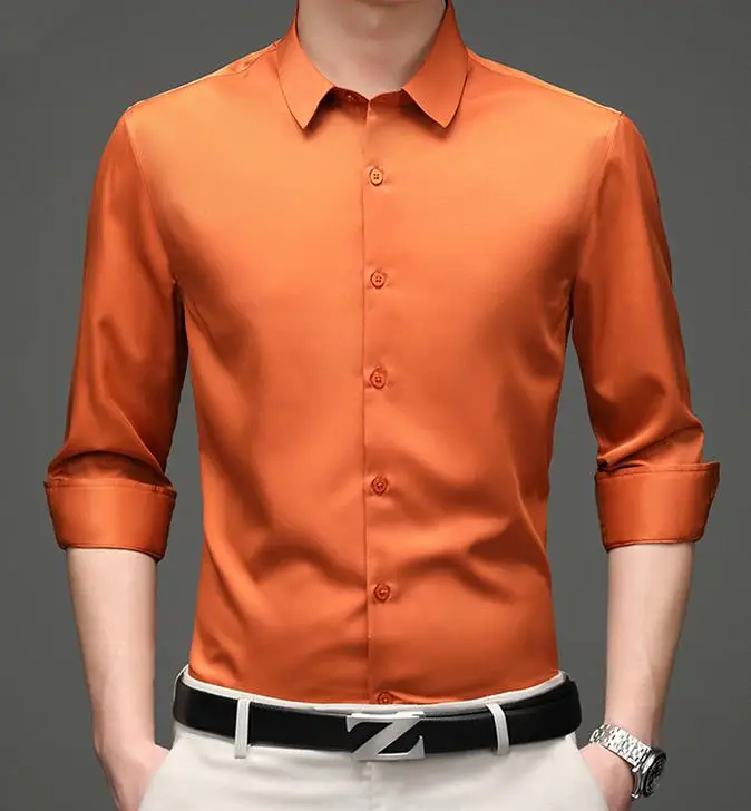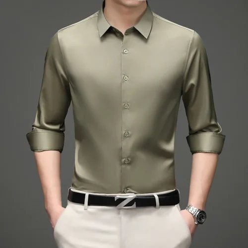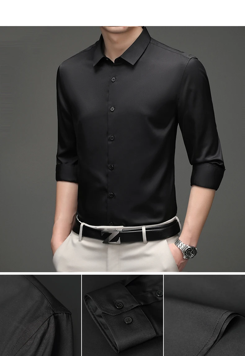 Product Name: 9747-T -Classic Silk Satin Men’s Plaid Dress Shirts Casual Long Sleeve Button Down Collarless Dress Shirt