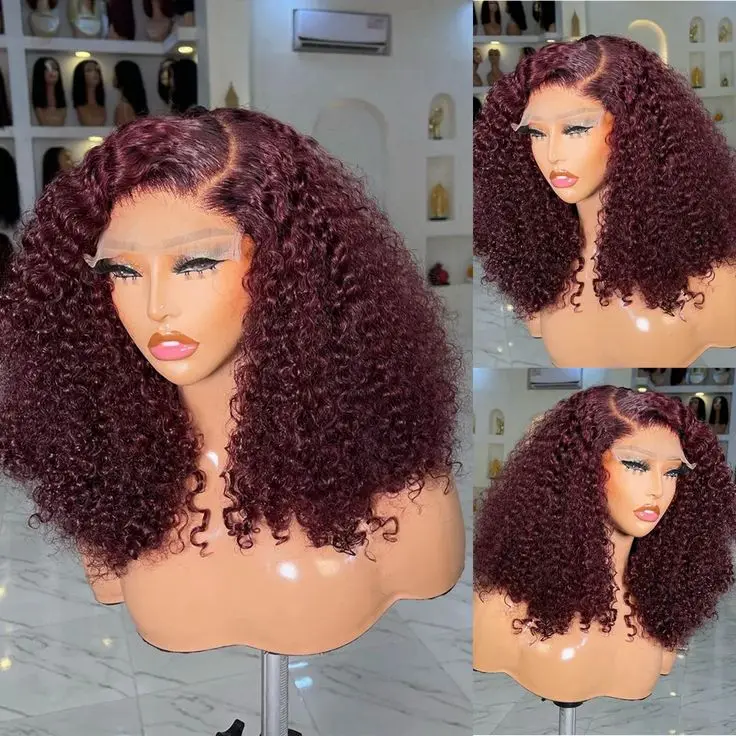 99J Wine Red Double Drawn Kinky Curly Bob 5×5 13×4 Transparent Lace Frontal Brazilian Virgin Hair Human Hair Wig