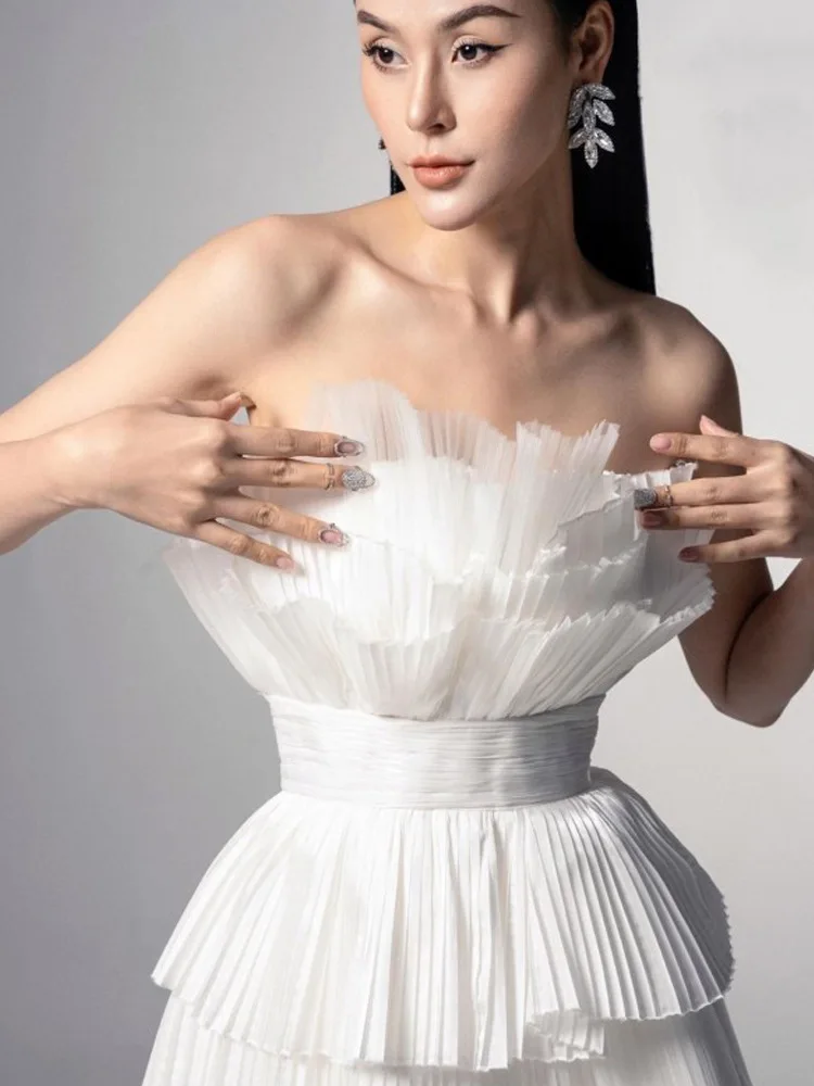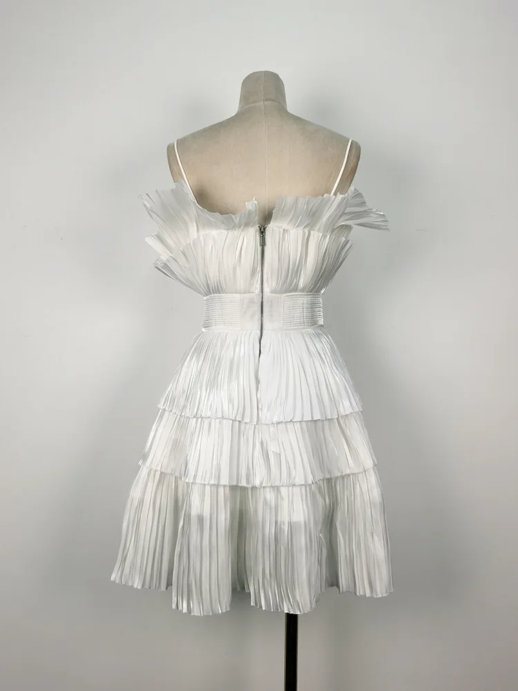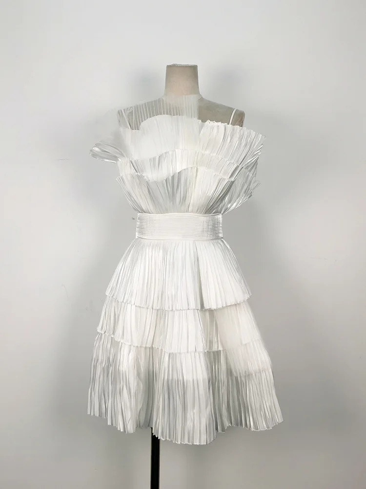 A Line Three-dimensional Pleated Fan-shaped Mesh Puff Evening Party Dress with Ruffle