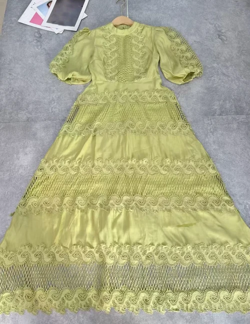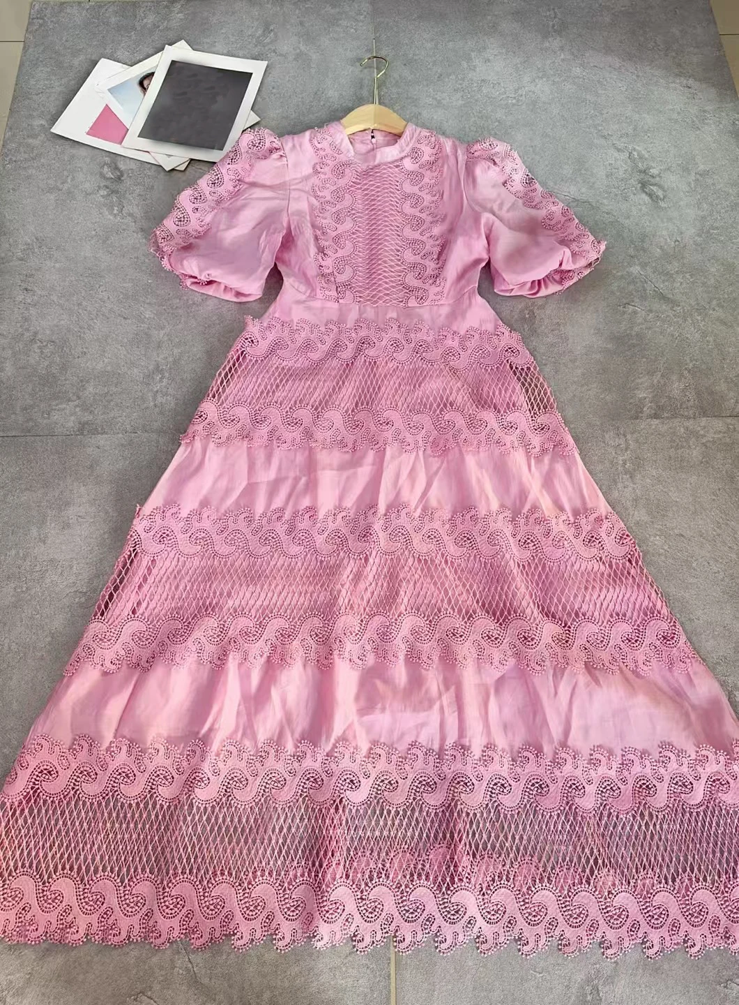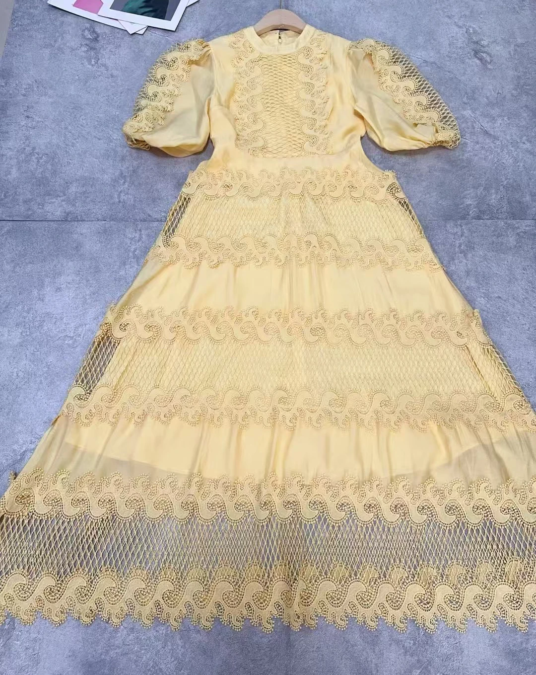 Product Name: AELESEEN 2025 Spring Summer Puff Sleeve Midi Dress Women Runway Fashion Flower Embroidery Hollow Out Patchwork Elegant Casual