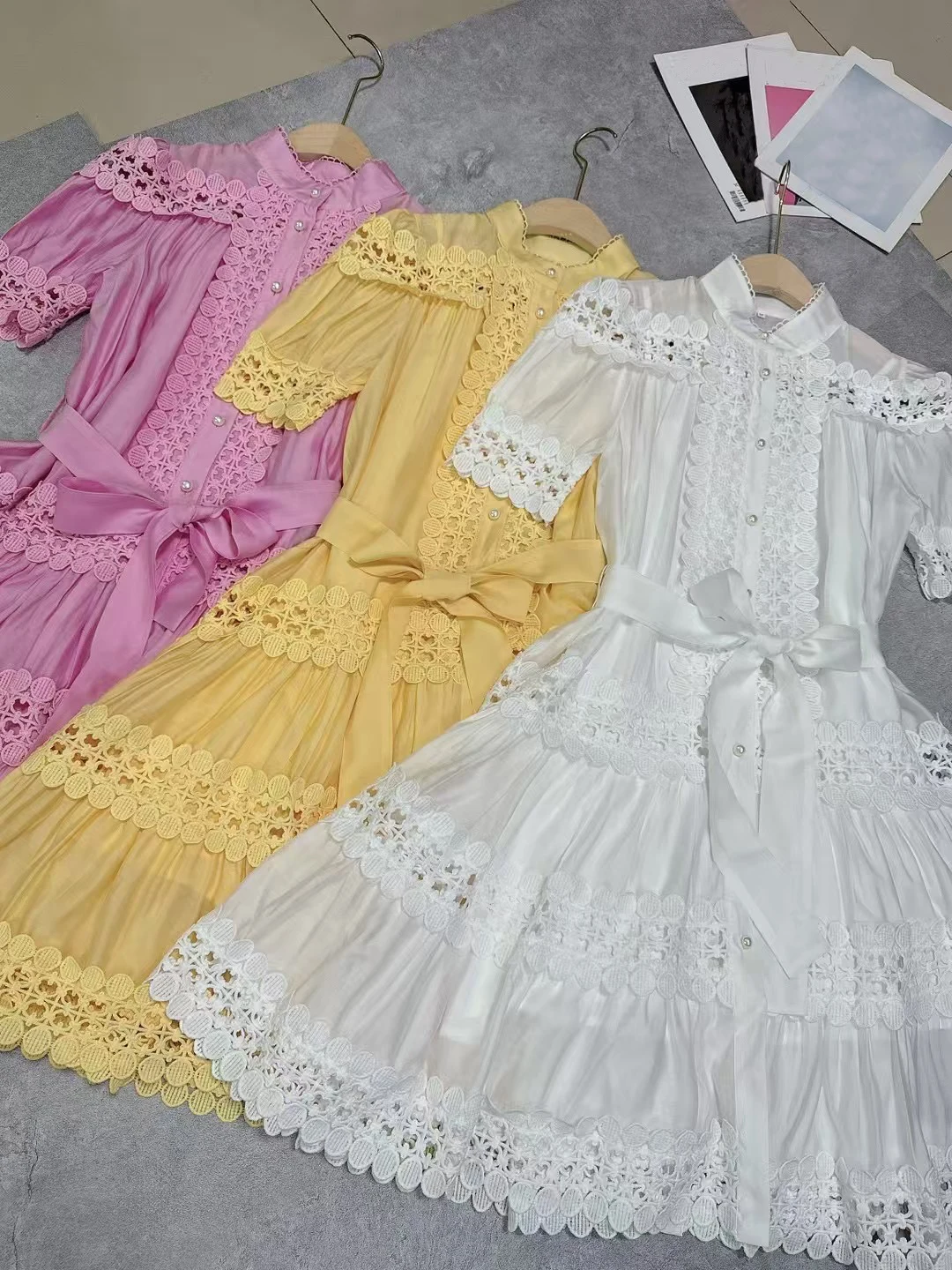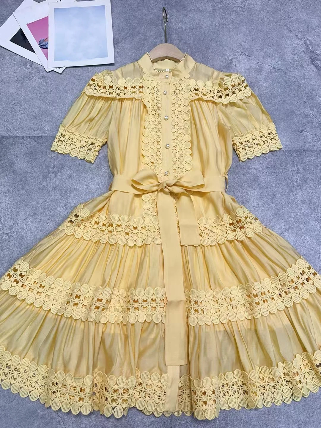 Product Name: AELESEEN Designer Fashion Elegant Mini Dress Women Short Sleeve Hollow Out Embroidered Lace Waist Slimming Ruffles Belt Female