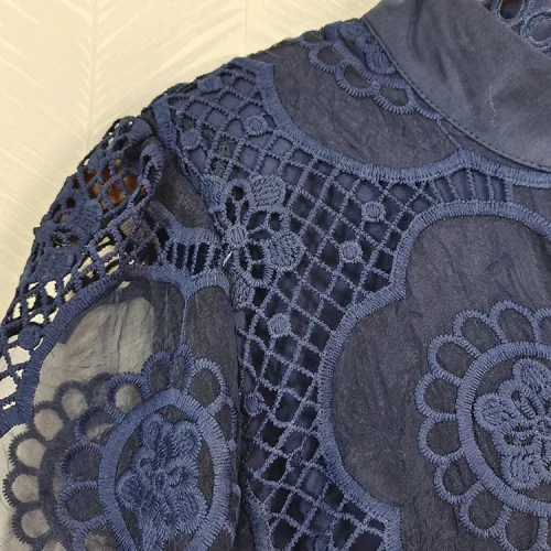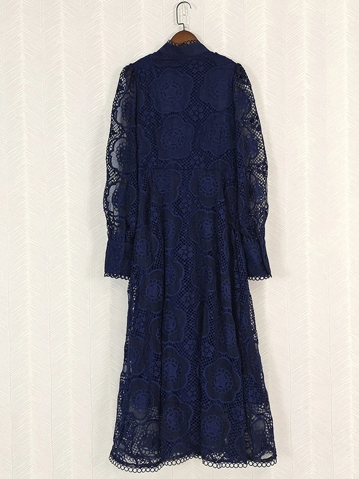 Product Name: AELESEEN Designer Navy Blue Lantern Long Party Dress Women Spring Autumn Flower Embroidery Hollow Out Fashion Lace Black Belt