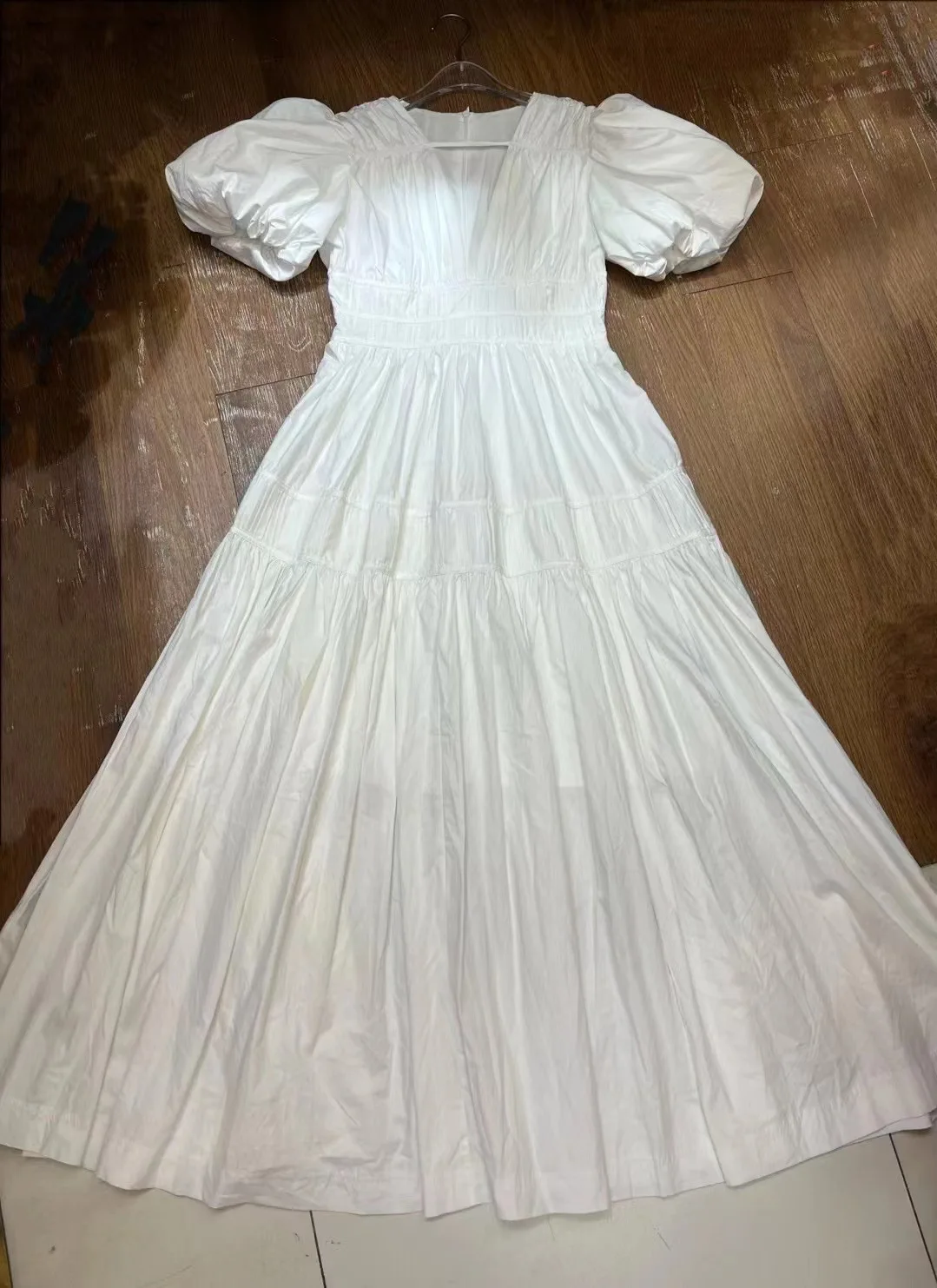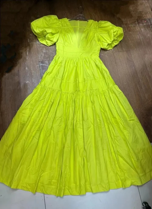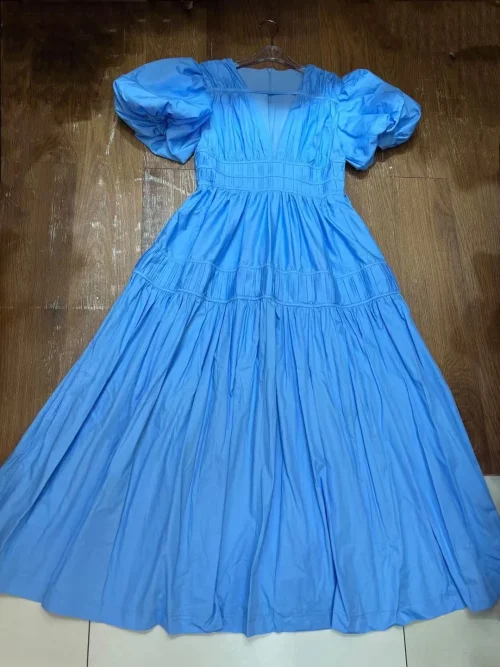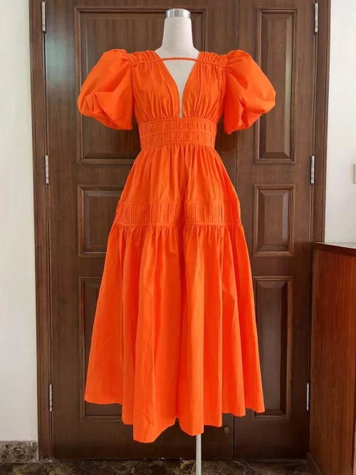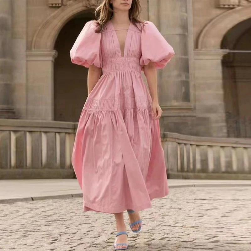 Product Name: AELESEEN Retro Solid Summer Dress Women Sexy V-neck Puff Short Sleeve High Waist Pleated Elegant Fashion Party Holiday Casual