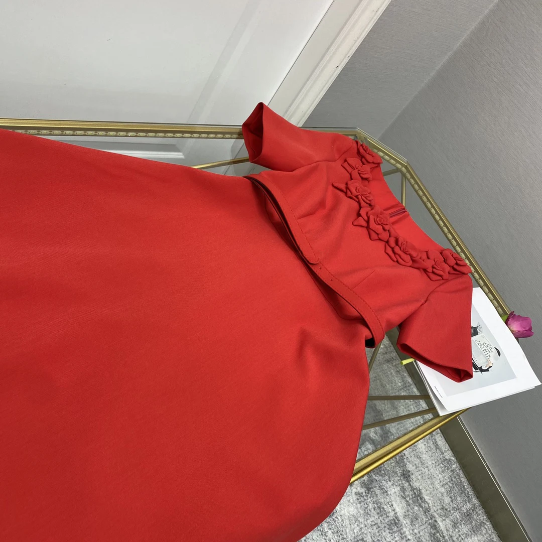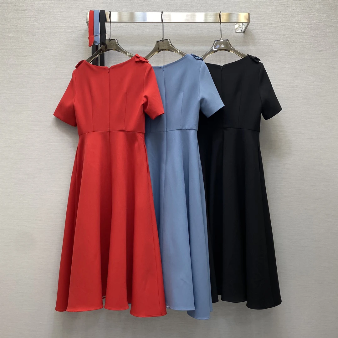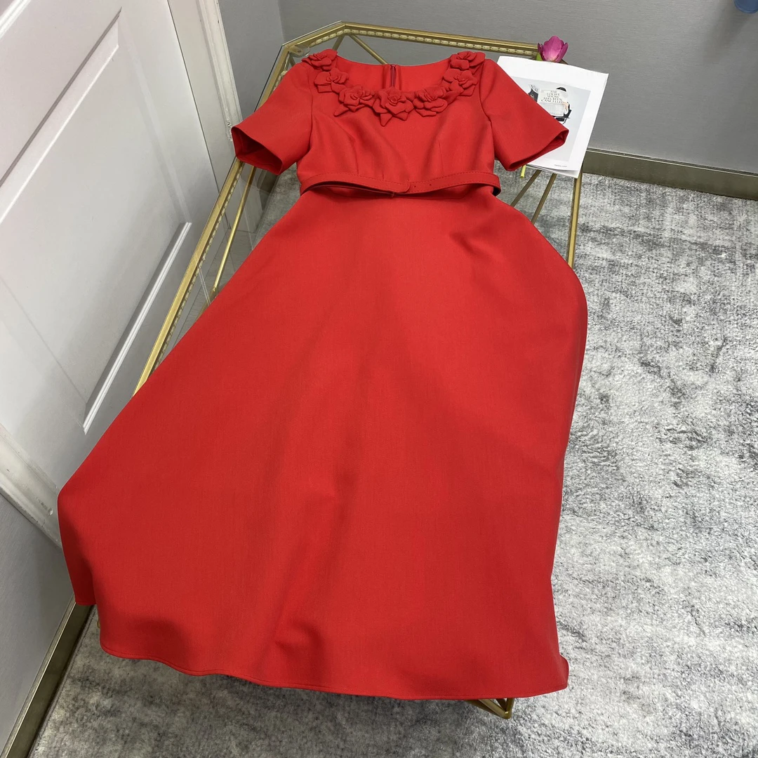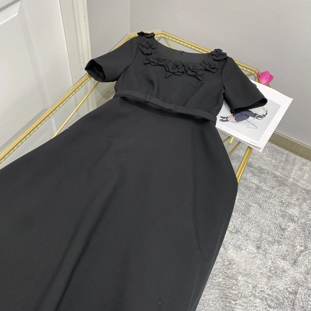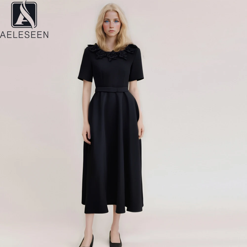 Product Name: AELESEEN Spring Summer Women’s New Temperament 3D Appliques Flower O-neck Short Sleeved Dress Belt Swing Fashion Long Party