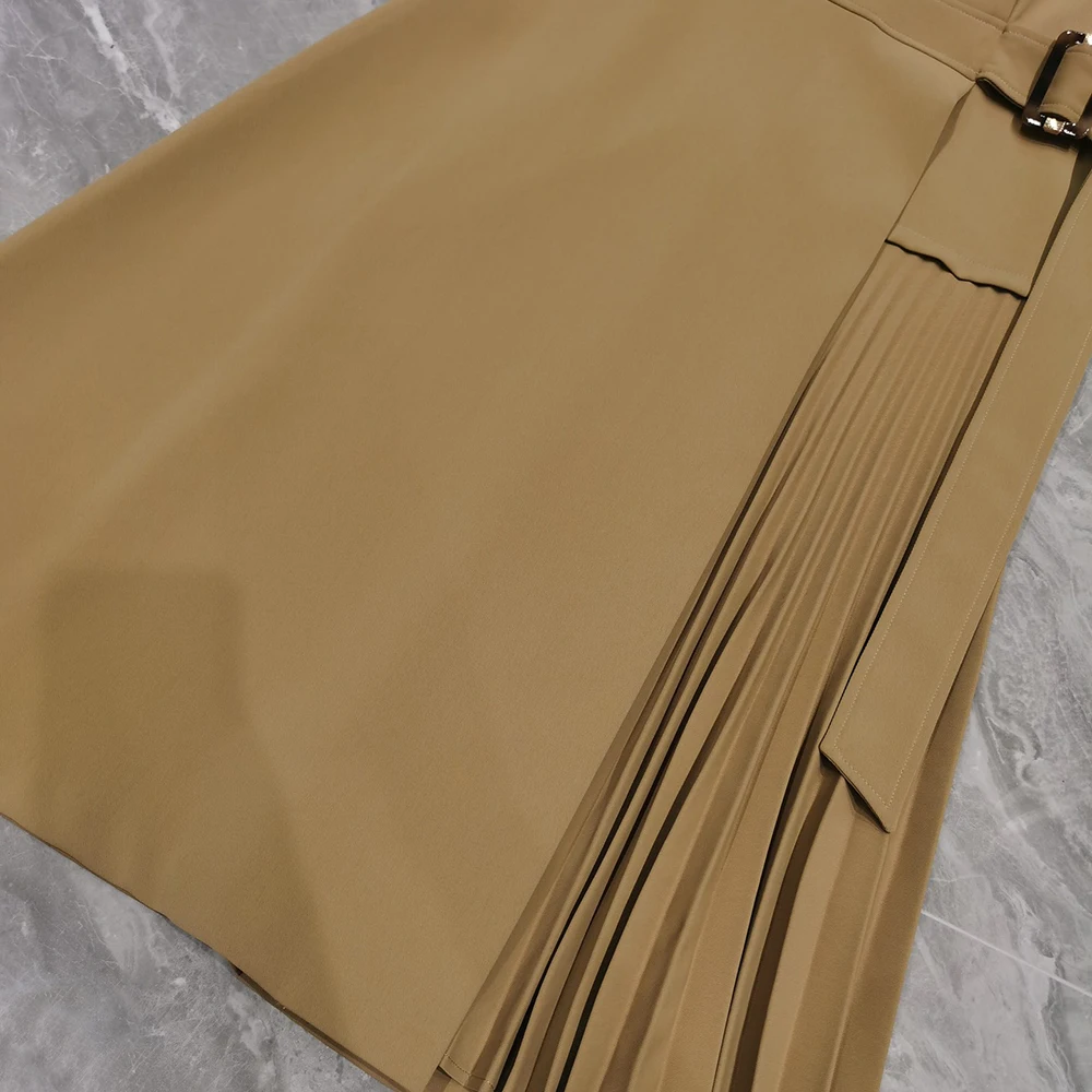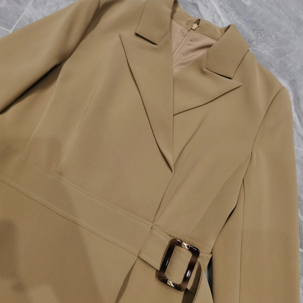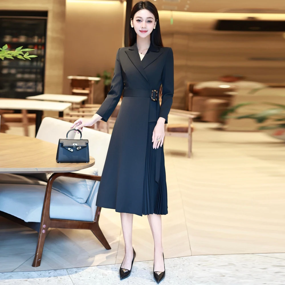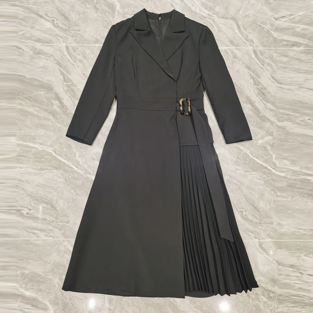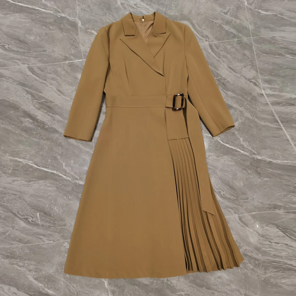 AELESEEN Women’s Long-Sleeved Elegant Dress Autumn Winter Office Ladies Pleated Fold Turn-down Belt Solid Midi Career Clothing