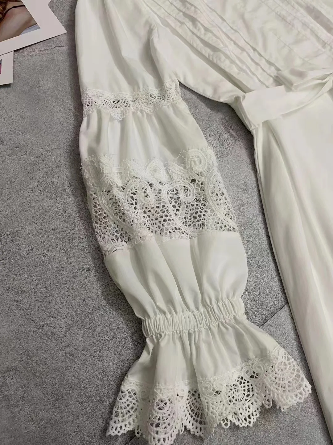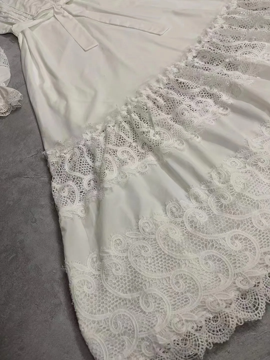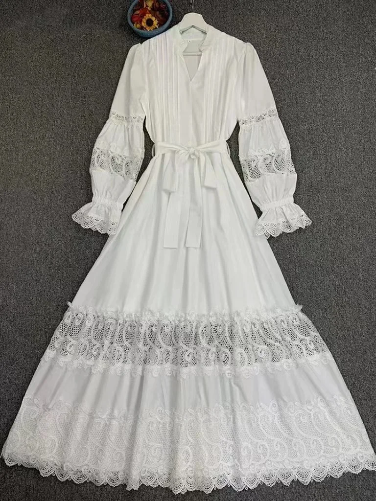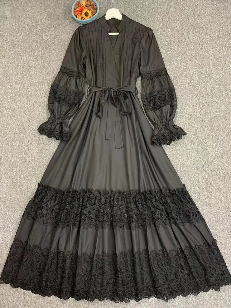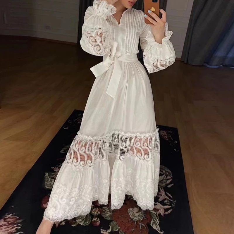 Product Name: AELESEEN Women’s Vintage Solid V-Neck Midi Dress Designer Fashion Lace Hollow-out Lantern Sleeves Flower Casual Back Maxi Party