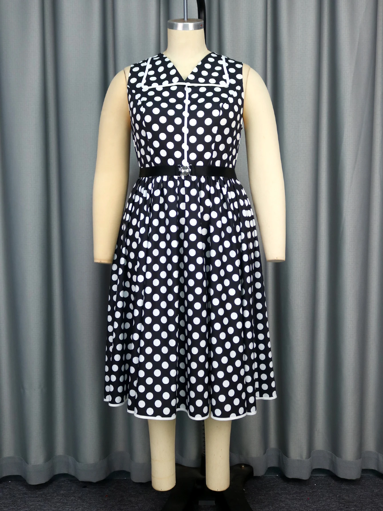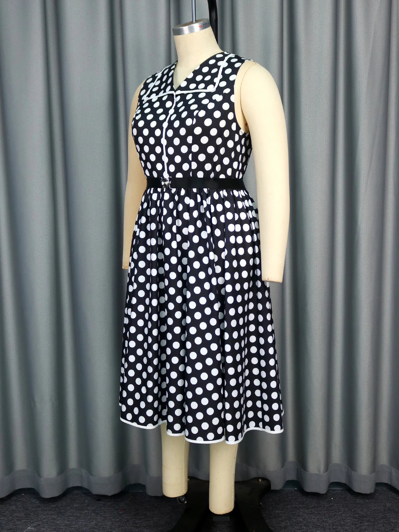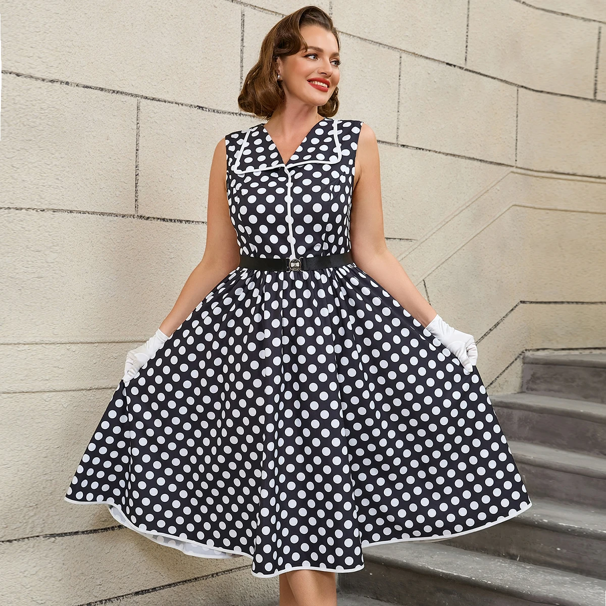 Product Name: AOMEI Lapel Collar Sleeveless Summer Sundress Casual Black White Polka Dot Dresses with Belt