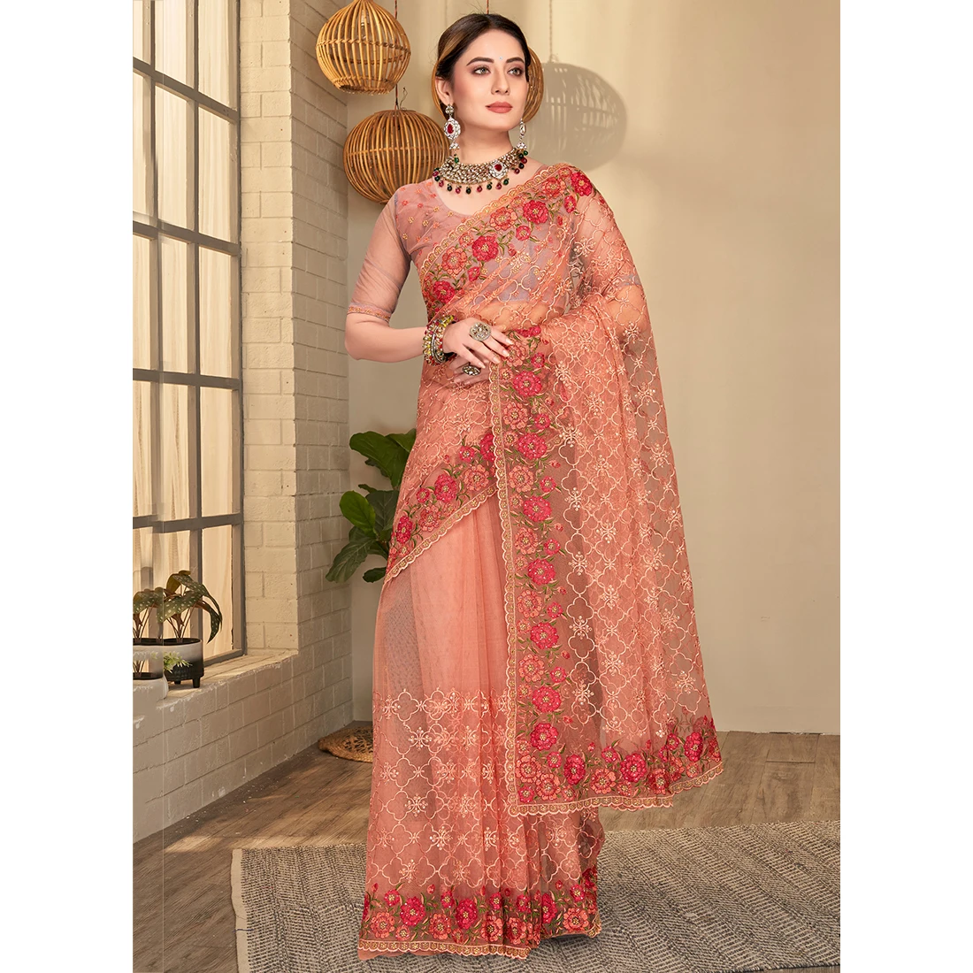 Attractive Dusty Peach Resham Work Net Saree Modest Wedding Dress