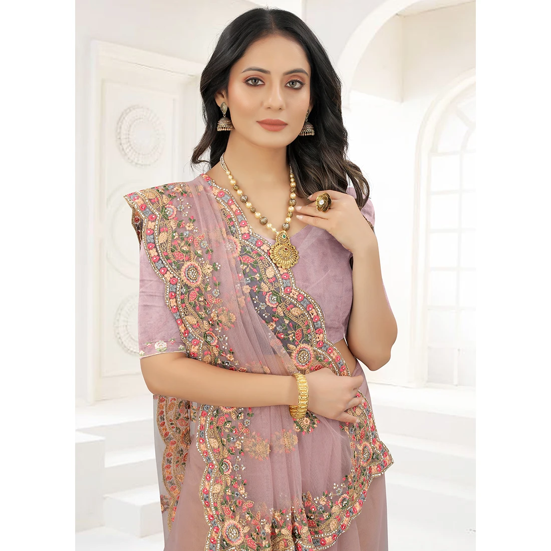 Attractive Purple Resham Work Net Saree Elegant Career Dress