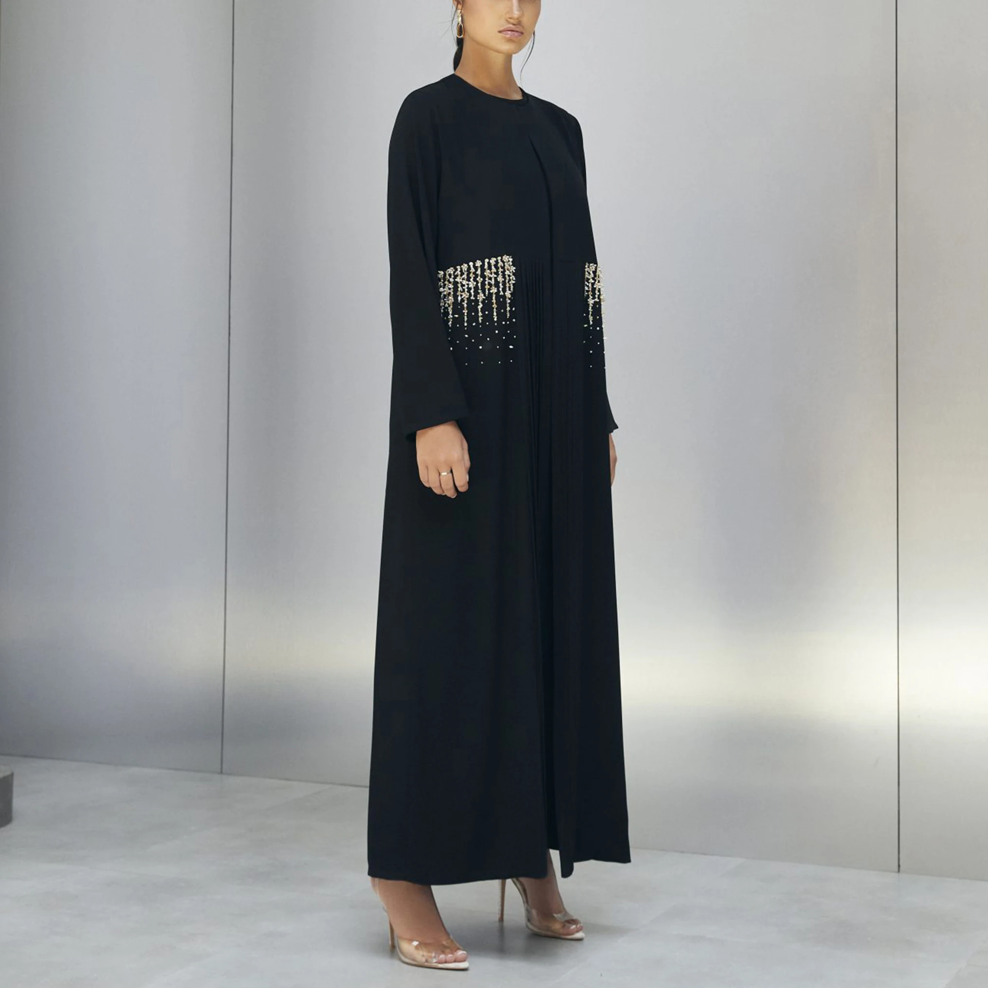 Product Name: Black Islamic Muslim Eid Arab Wear Round Neck Beaded Plisse Abaya Maxi Dress for Casual Women Clothing Abaya Dubai Adults 0.58kg