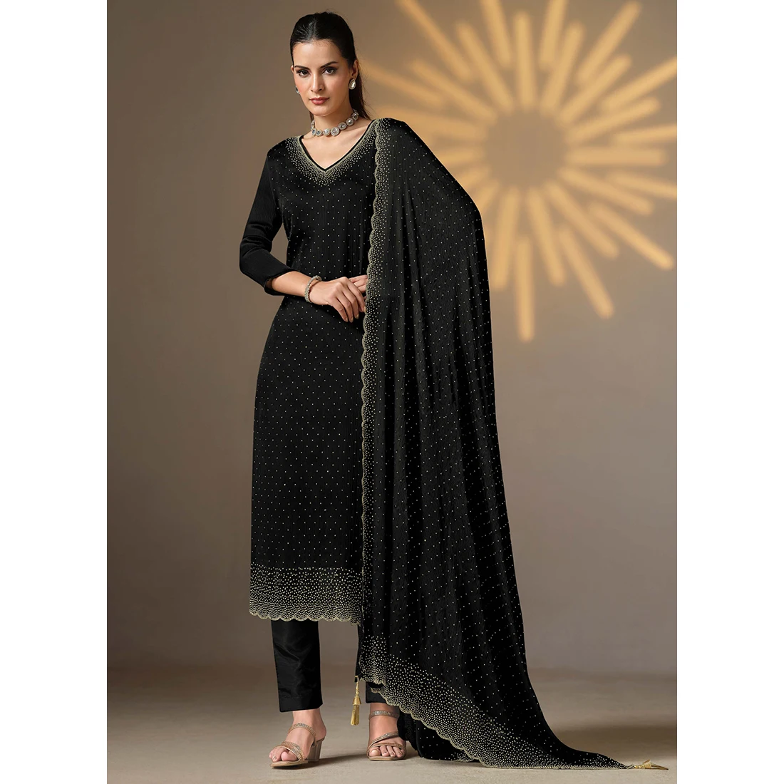 Black Satin Chiffon Straight Salwar Suit with Swarovski for Work and Parties Elegant Jumpsuit Design
