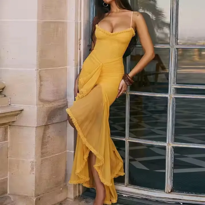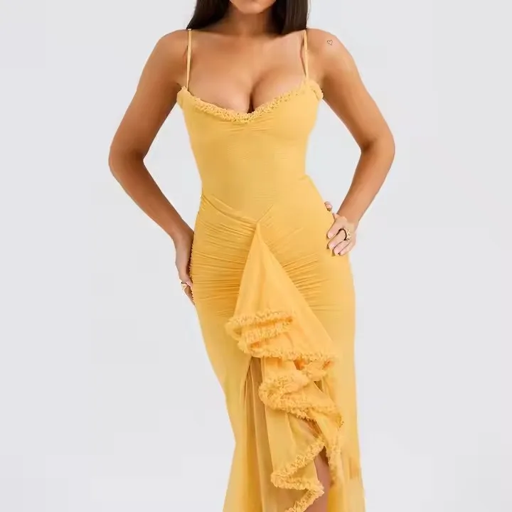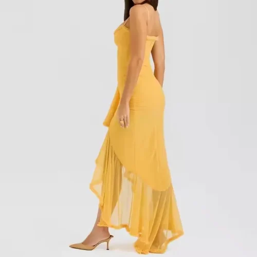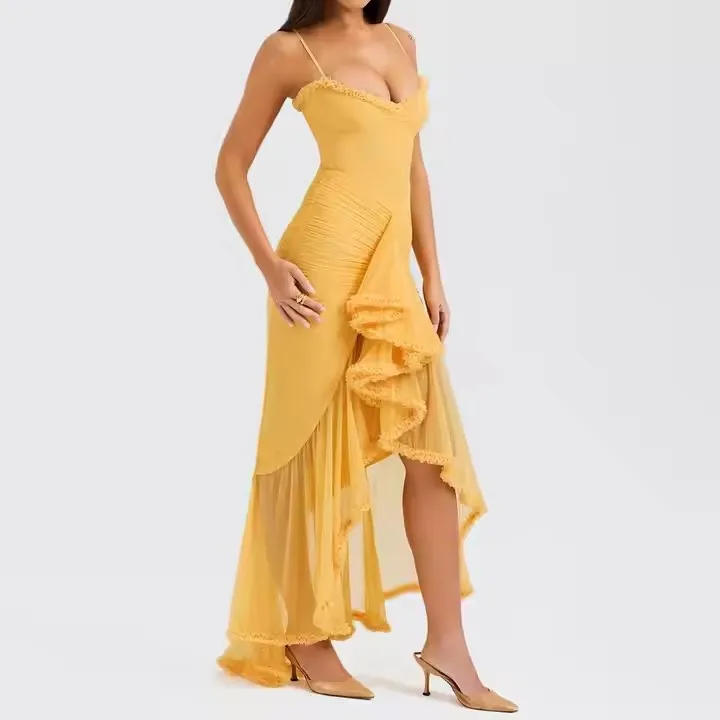 Bodycon Women Dress Party Evening Ladies Asymmetrical Mesh Ruffles Spaghetti Strap Pleated Mermaid Hem Dresses Mesh Dress Women