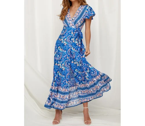 Product Name: Bohemian Chic V-Neck Slit Maxi Dress Sexy Floral Print Beach Sundress for Women Casual Summer Tropical Vacation Dresses
