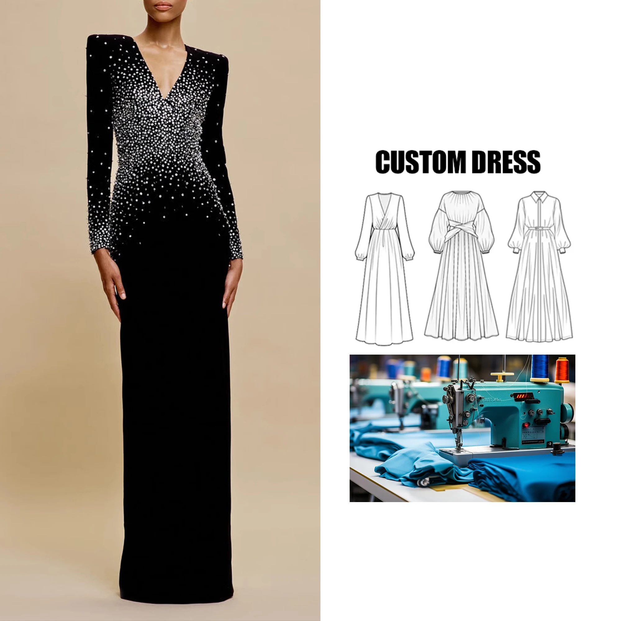 Brand Deep V Neck High-Slit Women’s Sequin Bodycon Prom Dress Evening Banquet Party Gown Pearls Sexy Waisted Split Vestido