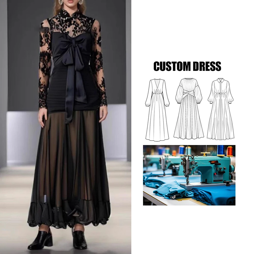 Brand ization High Waist Summer Perspective Club Dress Women Bow Sexy Lace Long Sleeve Maxi Dress