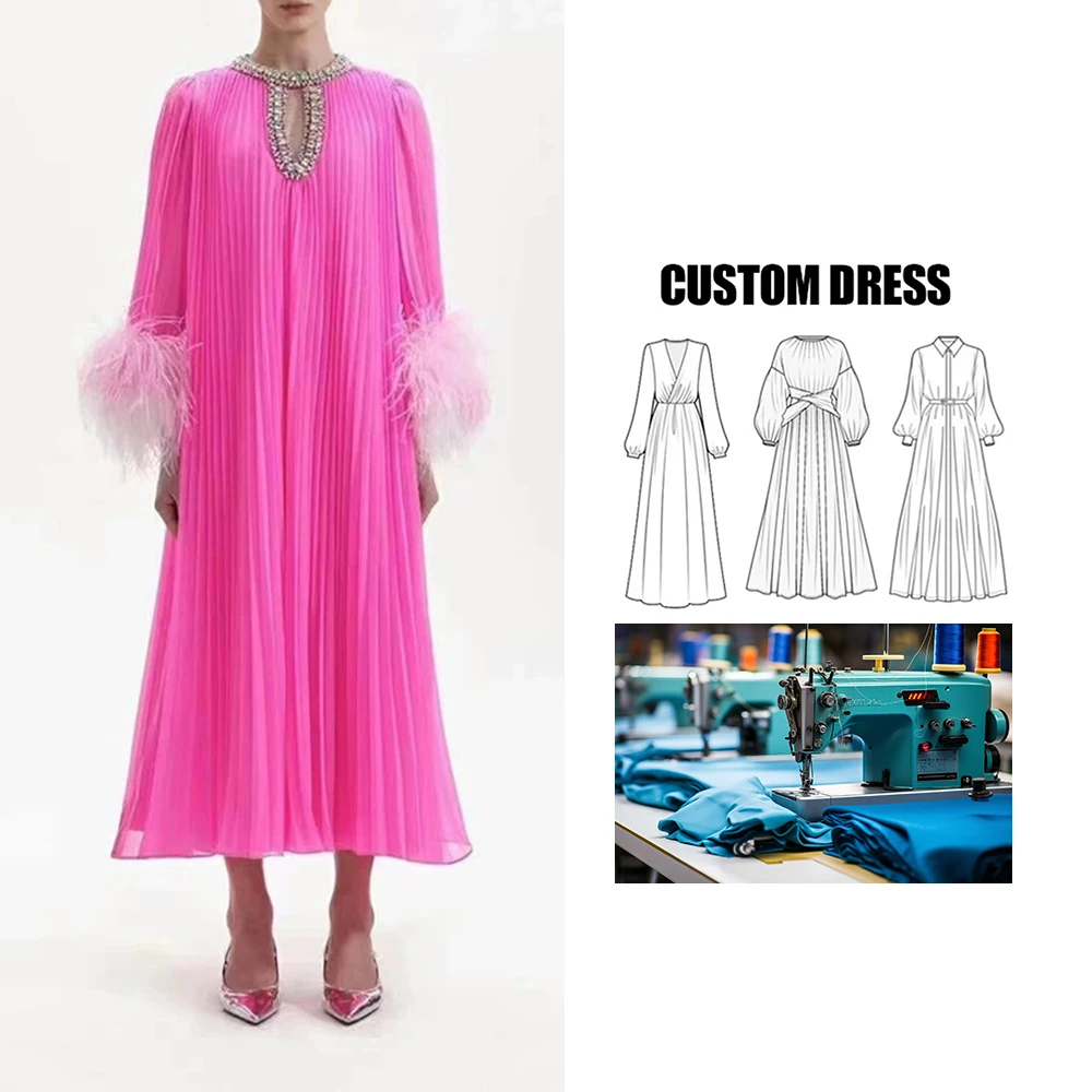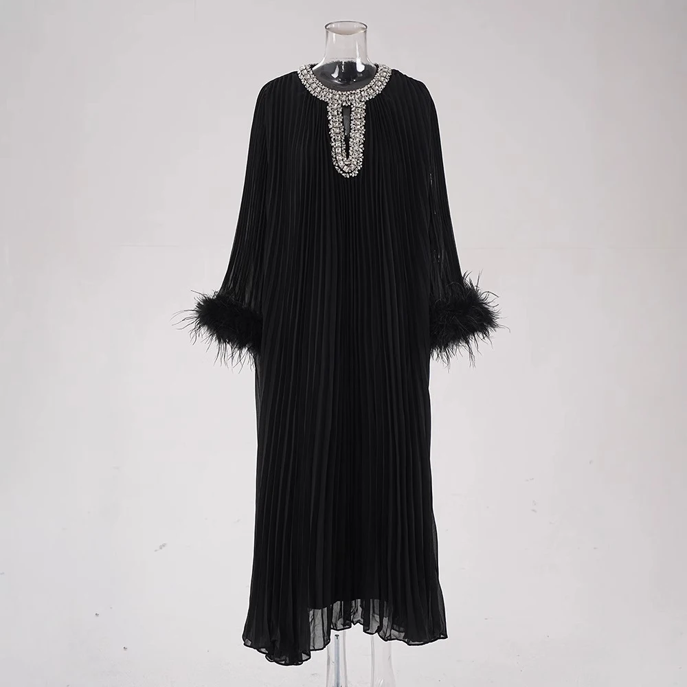 Product Name: Brand ization Loose-fit Design Rhinestones Long Sleeve Feathers Maxi Party Evening Pleated Dress for Women Sexy Ladies