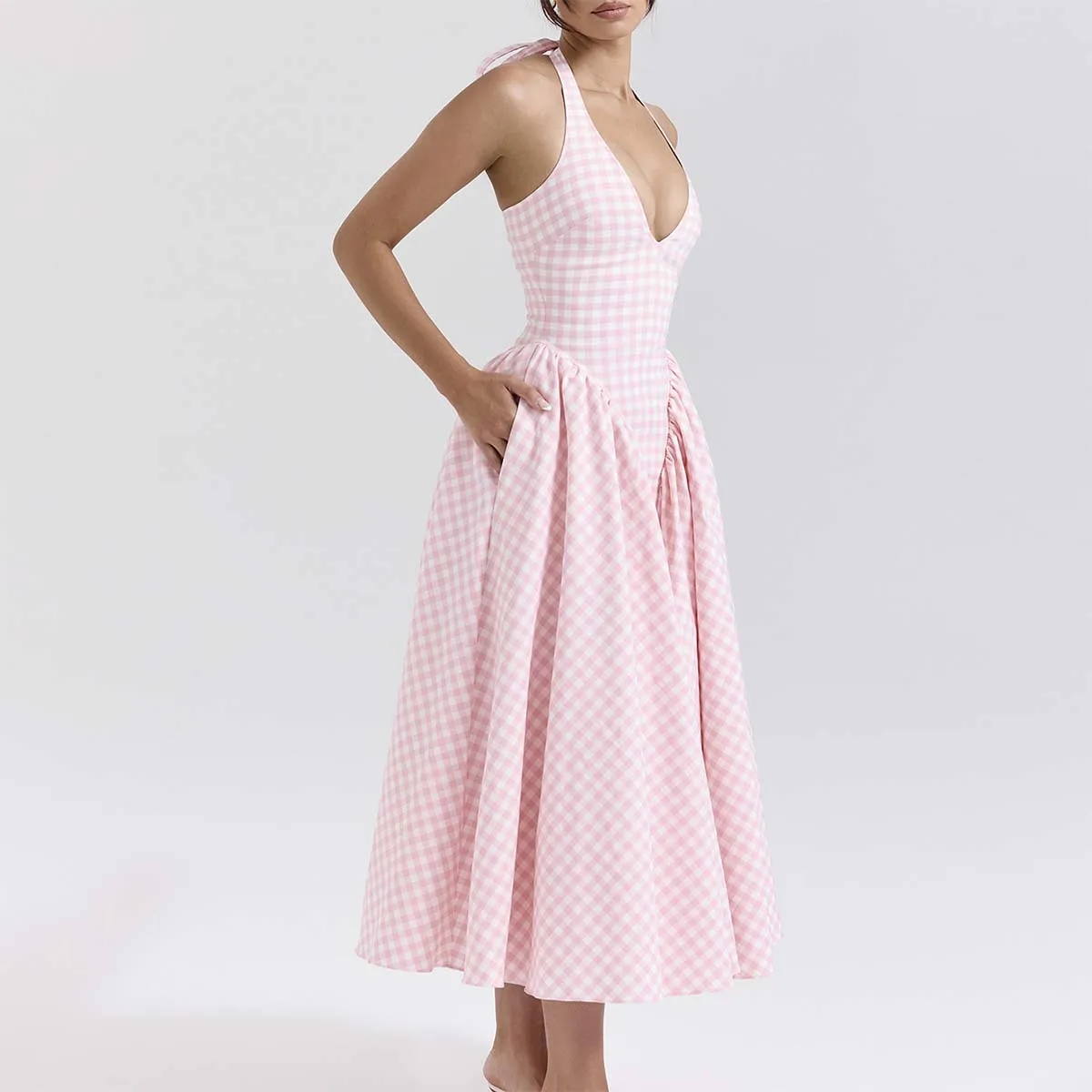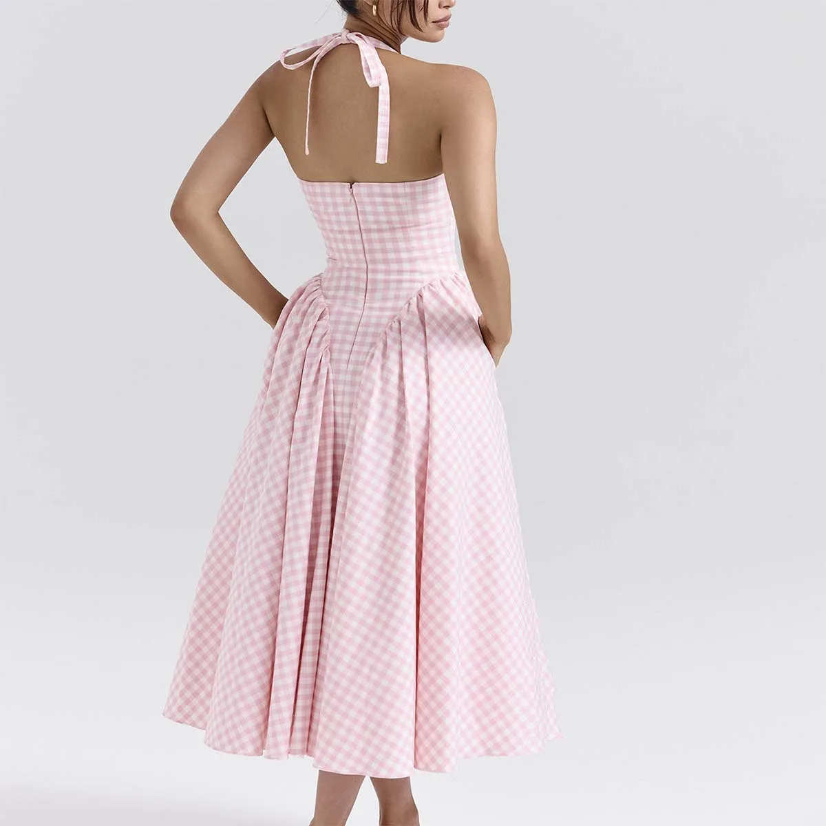 Product Name: Charming Gingham Halter Midi Sundress Perfect for Sunny Days Women Clothing