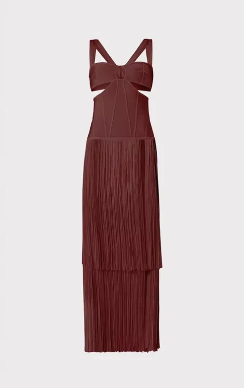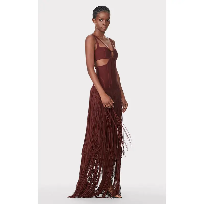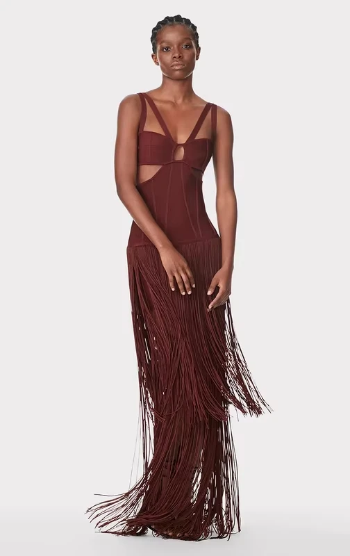 Clothing Manufacturers Women Luxury Dress Elegant Bohemian Brown Maxi Dress With Fringe and Cut-Out Dress