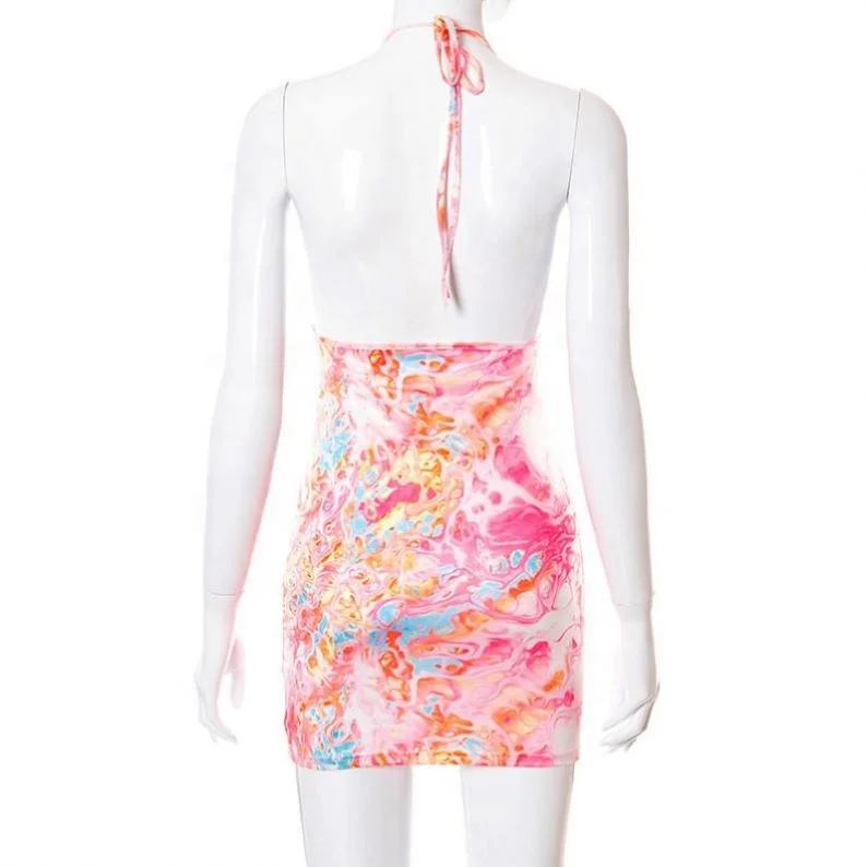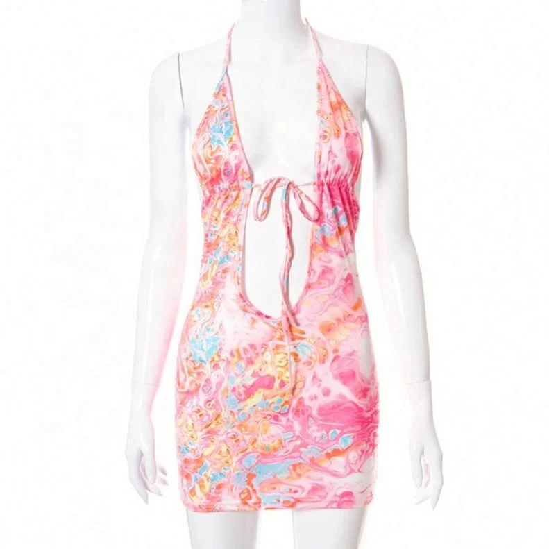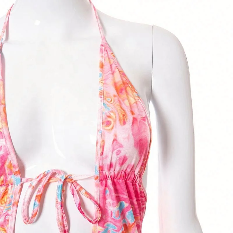 Deep V Neck Printed Flower Color Halter Sexy Mini for Women’s Dress Backless Beach Sundress Lace up