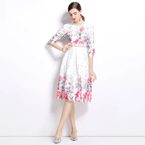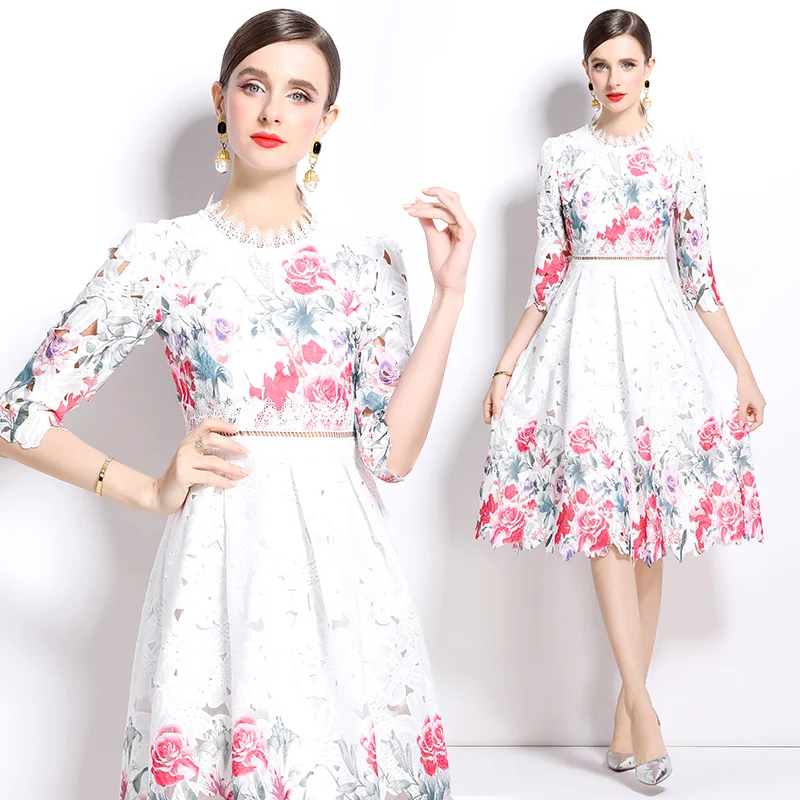 Product Name: Droma in Stock Fashion Vintage Hollow Out Lace Midi Length Floral Casual Dresses Elegant Women Lady