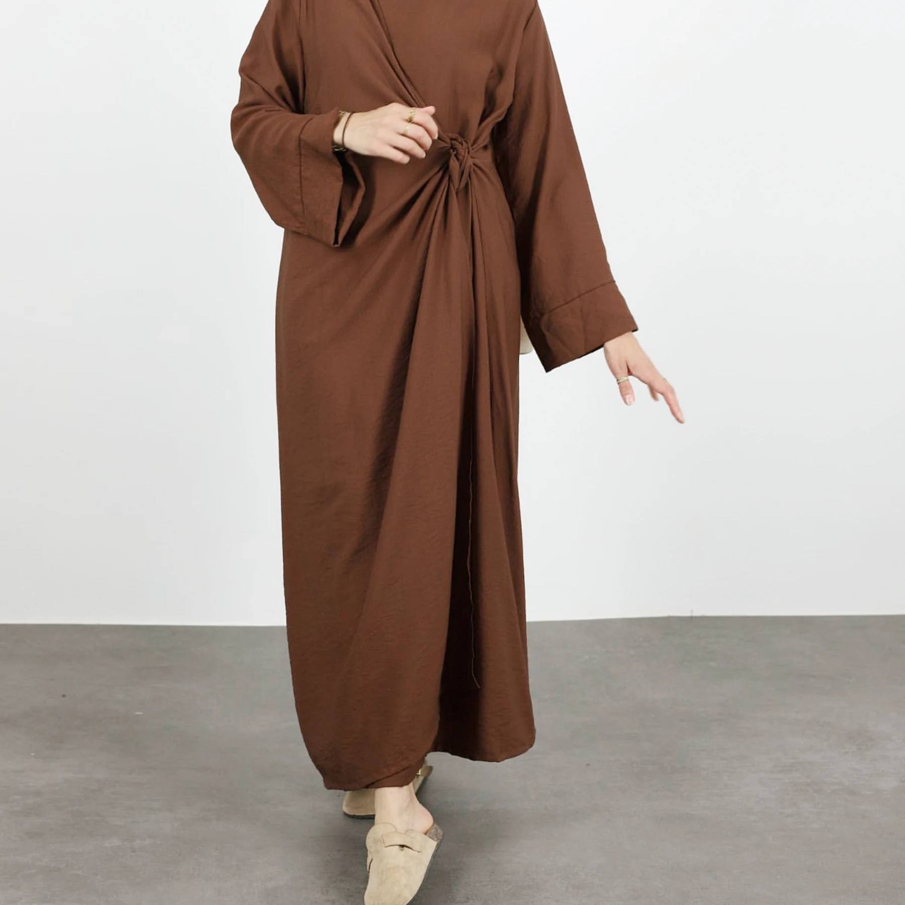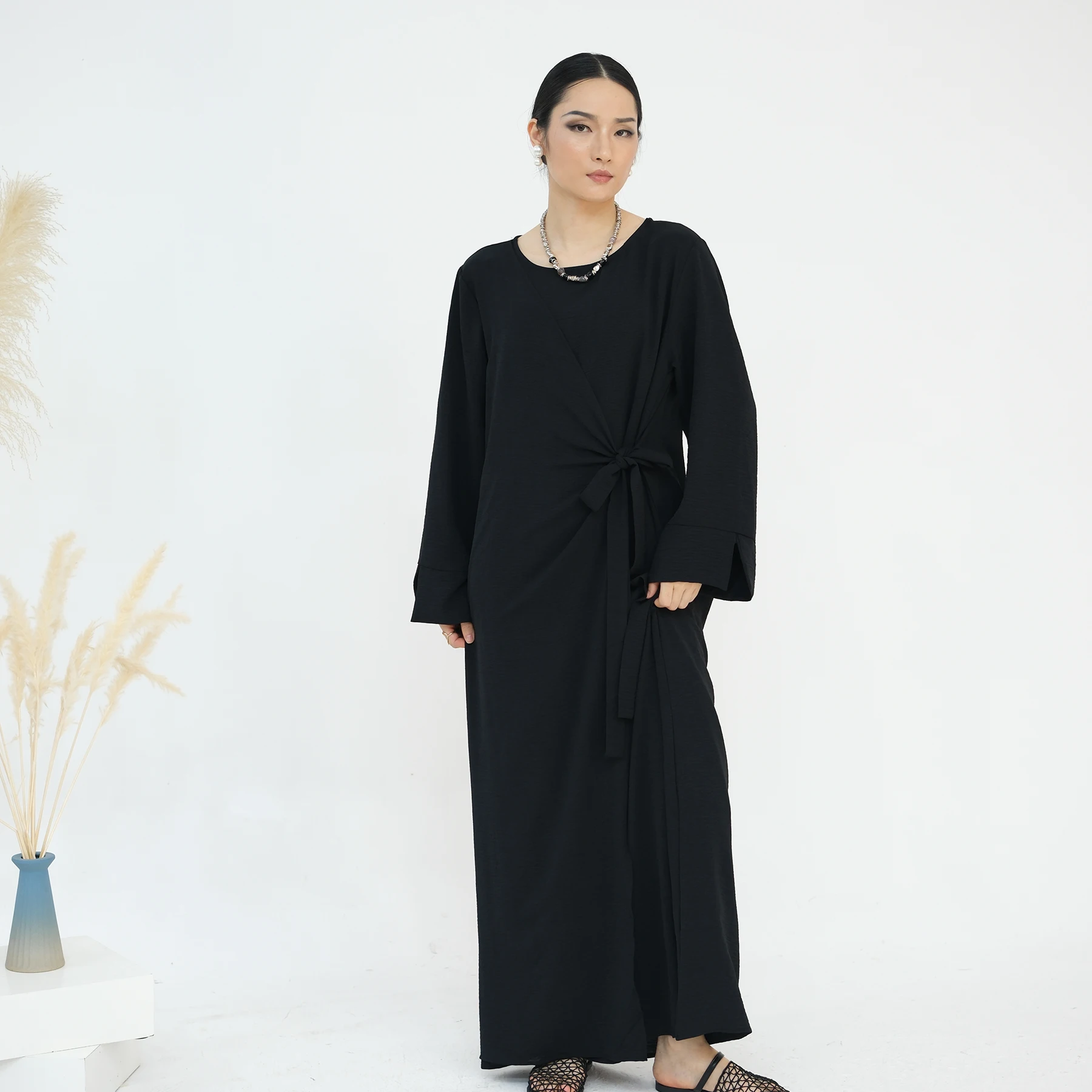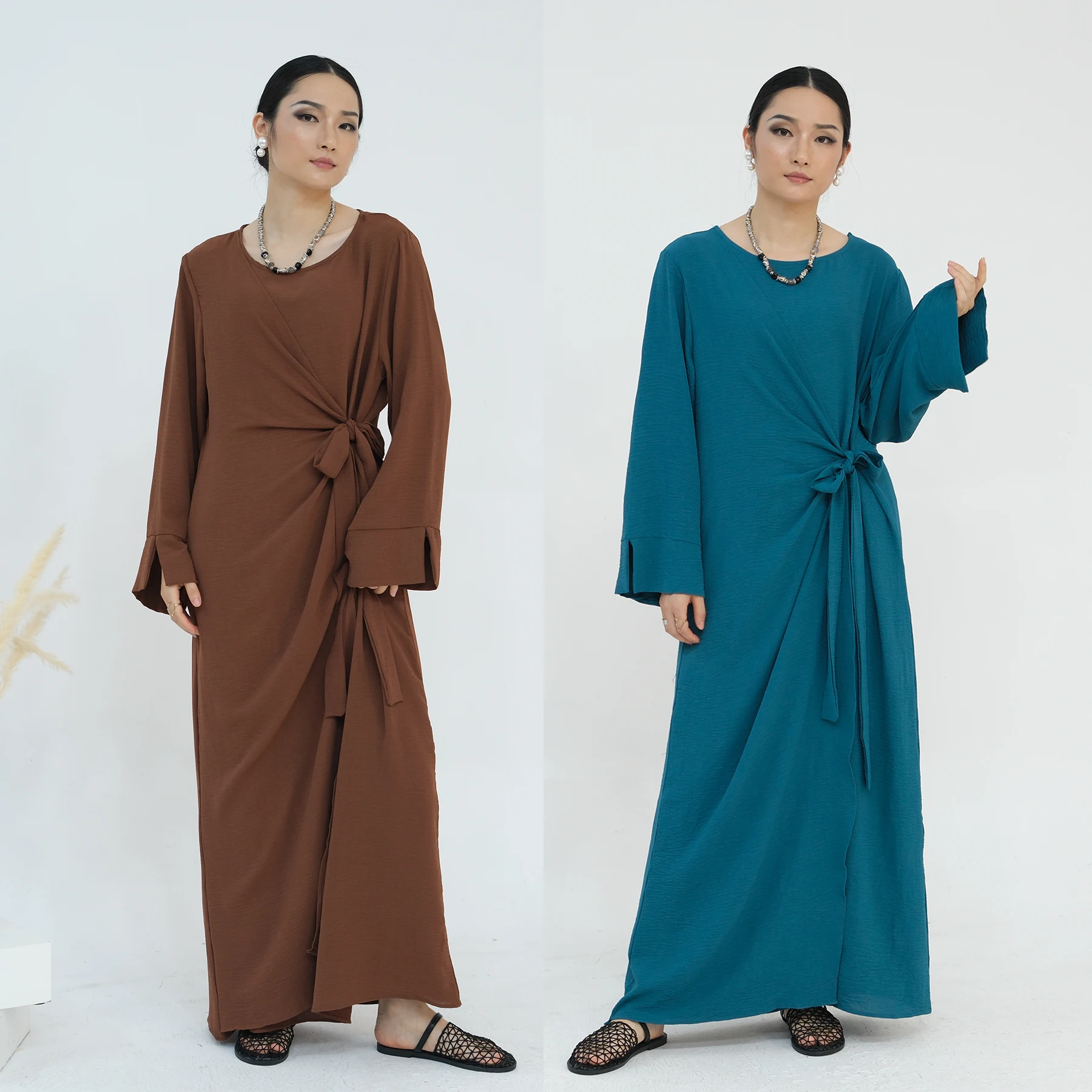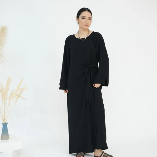 Product Name: Dubai Abaya Manufacturer Elegant Casual Wear Tie Belt Wrap Long Dresses Solid Color Slit Sleeves Modest Abaya Women Muslim Dress