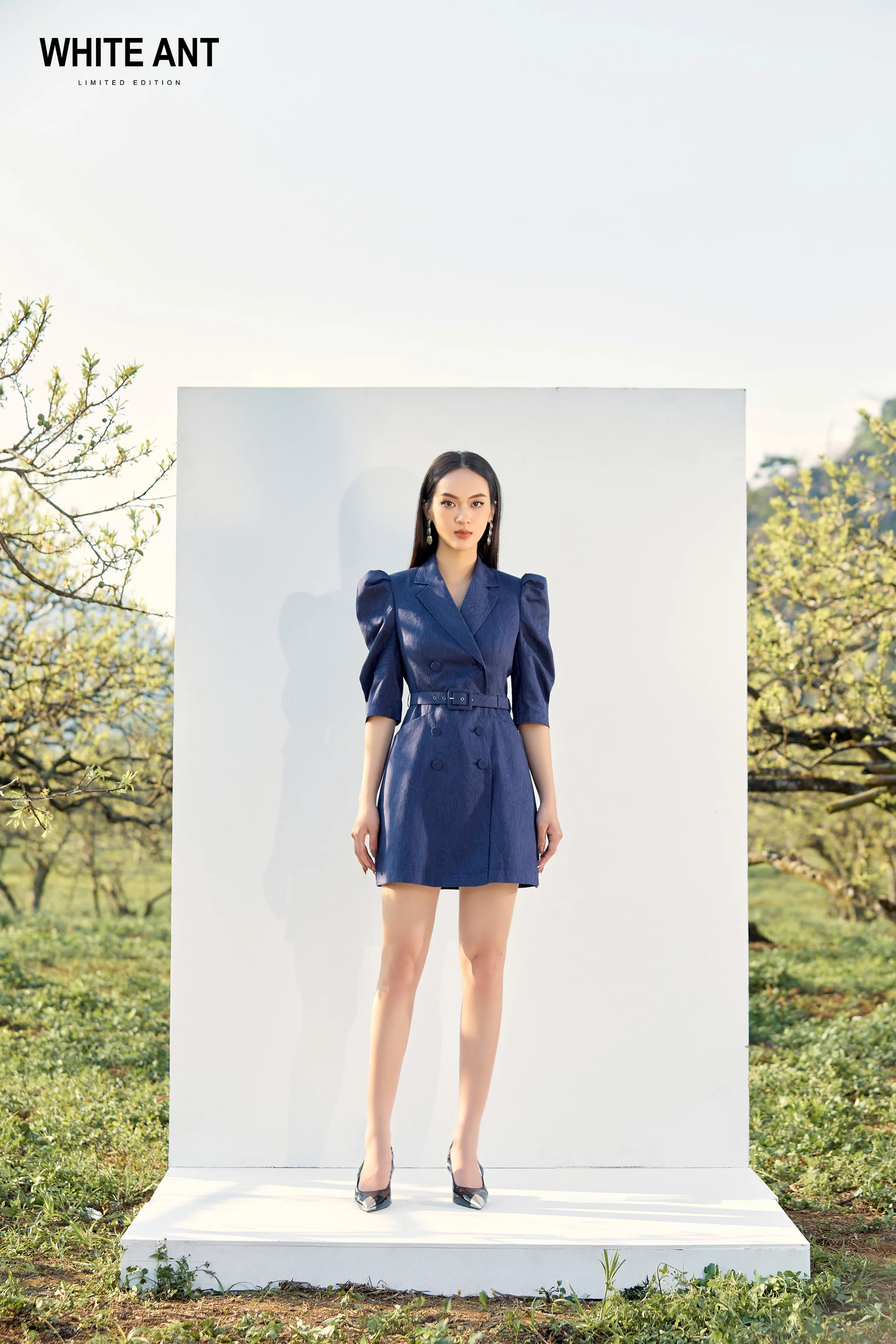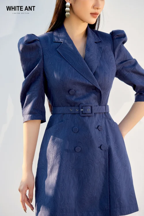 Product Name: Eco Friendly Stylish Organic Cotton Blue Lapel Collar Dresses With Waist Belt Jacquard Dresses Women Lady Elegant Button Decor